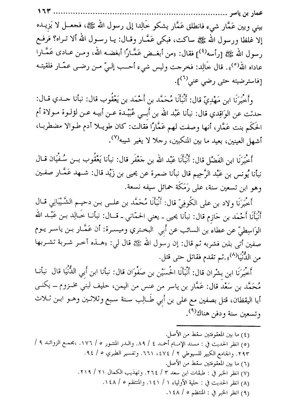 أَخْبَرَنَا ابن بشران قال: أنبأنا الحسين بن صفوان قال: نبأنا ابن أبي الدّنيا قال نبأنا مُحَمَّدُ بْنُ سعد قَالَ: عمار بْن ياسر من عنس من اليمن، حليف لبني مخزوم- يكنى أبا اليقظان، قتل بصفين مع عَلِيّ بْن أَبِي طالب سنة سبع وثلاثين وهو ابن ثلاث وتسعين سنة ودفن هناك [6] .