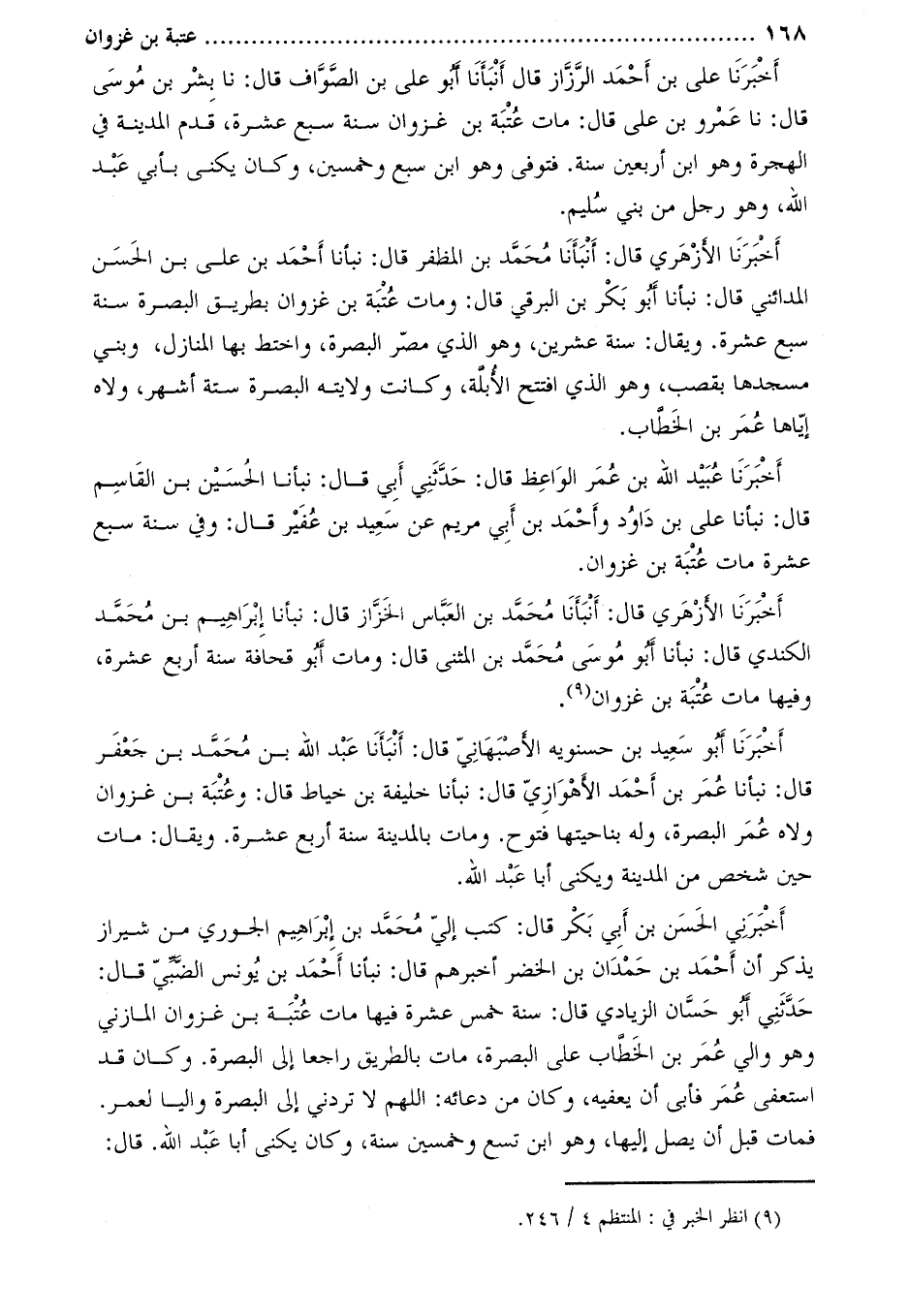 أَخْبَرَنَا عَلِيّ بْن أَحْمَد الرزاز قَالَ أَنْبَأَنَا أبو على بن الصّوّاف قال: نا بشر بن موسى قال: نا عمرو بْن عَلِيّ قَالَ: مات عتبة بْن غزوان سنة سبع عشرة، قدم المدينة في الهجرة وهو ابْن أربعين سنة. فتوفي وهو ابْن سبع وخمسين، وكان يكنى بأبي عَبْد الله، وهو رجل من بني سليم.