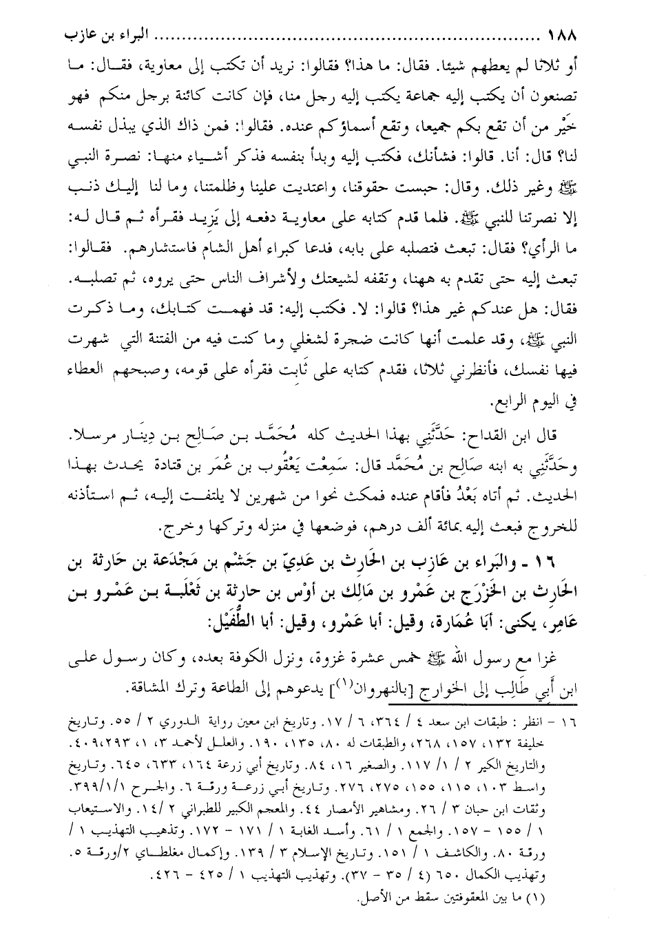 [1] 16- انظر: طبقات ابن سعد 4/364، 6/17. وتاريخ ابن معين رواية الدوري 2/55. وتاريخ خليفة 132، 157، 268، والطبقات له 80، 135، 190. والعلل لأحمد 3، 1، 293، 409.