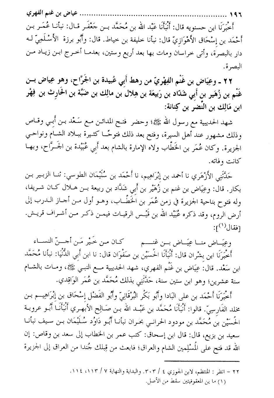 22- وعياض بْن غنم الفهري من رهط أَبِي عبيدة بْن الجراح، وهو عياض بْن غنم بْن زهير بْن أَبِي شداد بْن ربيعة بْن هلال بْن مالك بْن ضبة بْن الحارث بن فهر ابن مالك بْن النضر بْن كنانة [1] :