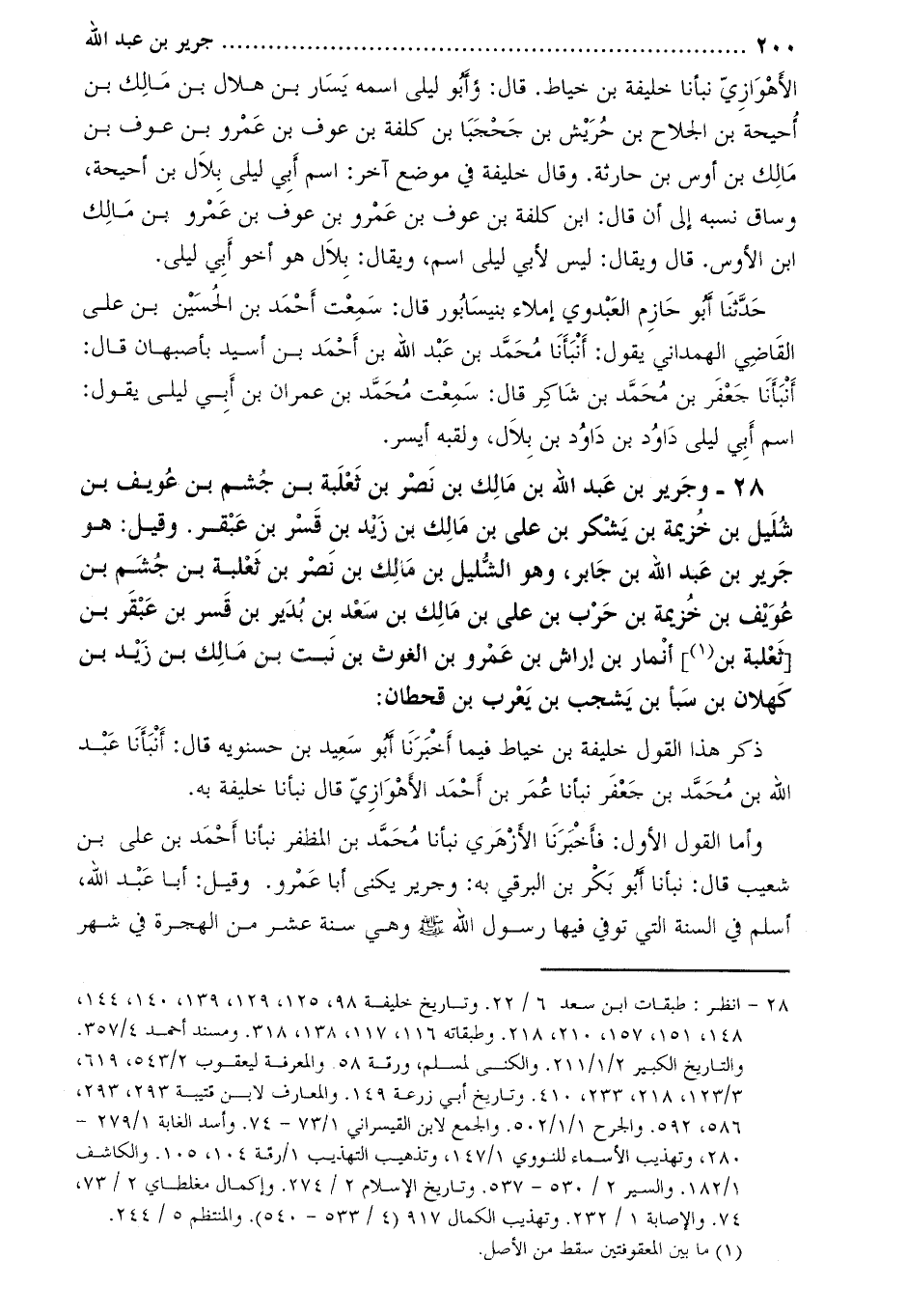 [1] 28- انظر: طبقات ابن سعد 6/22. وتاريخ خليفة 98، 125، 129، 139، 140، 144، 148، 151، 157، 210، 218. وطبقاته 116، 117، 138، 318. ومسند أحمد 4/357.