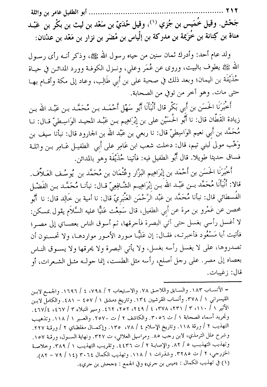 أَخْبَرَنَا الْحَسَنُ بْنُ أَبِي بَكْرٍ قال أنبأنا أبو سهل أحمد بن محمد بن عبد الله بن زيادة القطّان قال: نا أَبُو الْحُسَيْنِ عَلِيّ بْن إِبْرَاهِيمَ بْن عَبْد المجيد الواسطي قال: نا محمّد بن أبي نعيم الواسطيّ قال: نا ربعي بْن عَبْدِ اللَّهِ بْن الجارود قَالَ: نبأنا سيف بْن وهب مولى لبني تيم، قَالَ: دخلت شعب ابْن عامر على أَبِي الطفيل عامر بْن واثلة فساق حديثا طويلا. قَالَ أَبُو الطفيل فيه: فأتينا حذيفة وهو بالمدائن.
