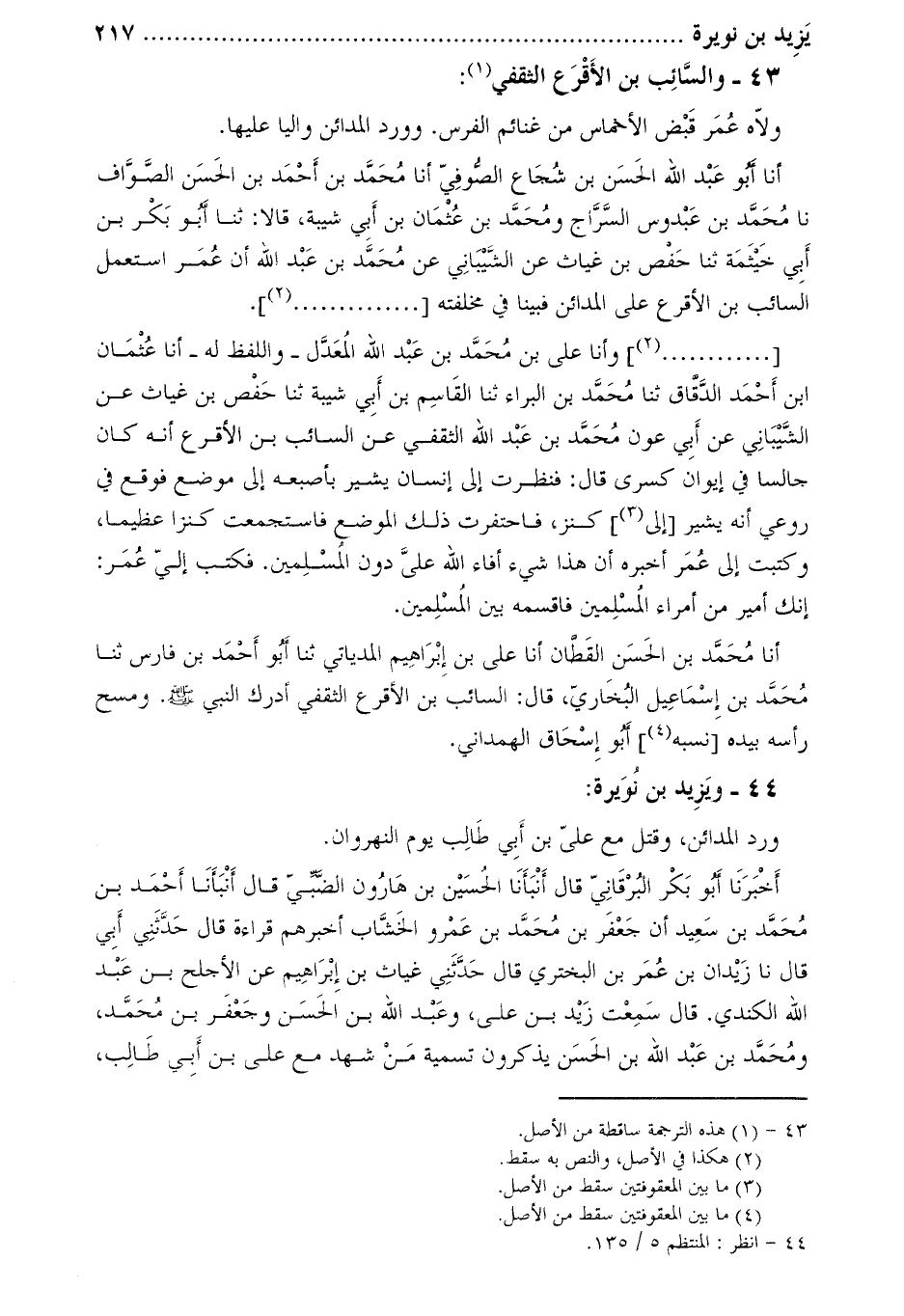 أنا أبو عبد الله الحسن بن شجاع الصّوفيّ أنا محمّد بن أحمد بن الحسن الصّوّاف نا مُحَمَّدُ بْنُ عَبْدُوسٍ السَّرَّاجُ ومُحَمَّد بْنُ عُثْمَانَ بن أبي شيبة، قالا: ثنا أبو بكر بن أبي خيثمة ثنا حَفْصُ بْنُ غِيَاثٍ عَنِ الشَّيْبَانِيِّ عَنْ مُحَمَّدِ بن عبد اللَّهِ أَنَّ عُمَرَ اسْتَعْمَلَ السَّائِبَ بْنَ الأَقْرَعِ على المدائن فبينا في مخلفته [.............. [2]] .