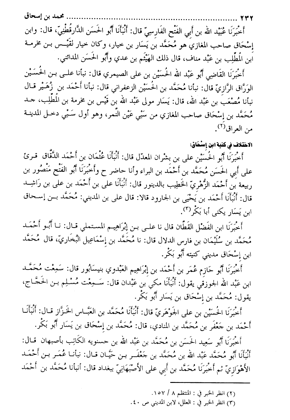 أخبرنا الحسين بن على الجوهريّ قال: أنبأنا محمّد بن العبّاس الخزّاز قال: أنبأنا أحمد بن جعفر بن محمد بن المنادي، قَالَ: محمد بن إسحاق بن يسار أبو بكر.