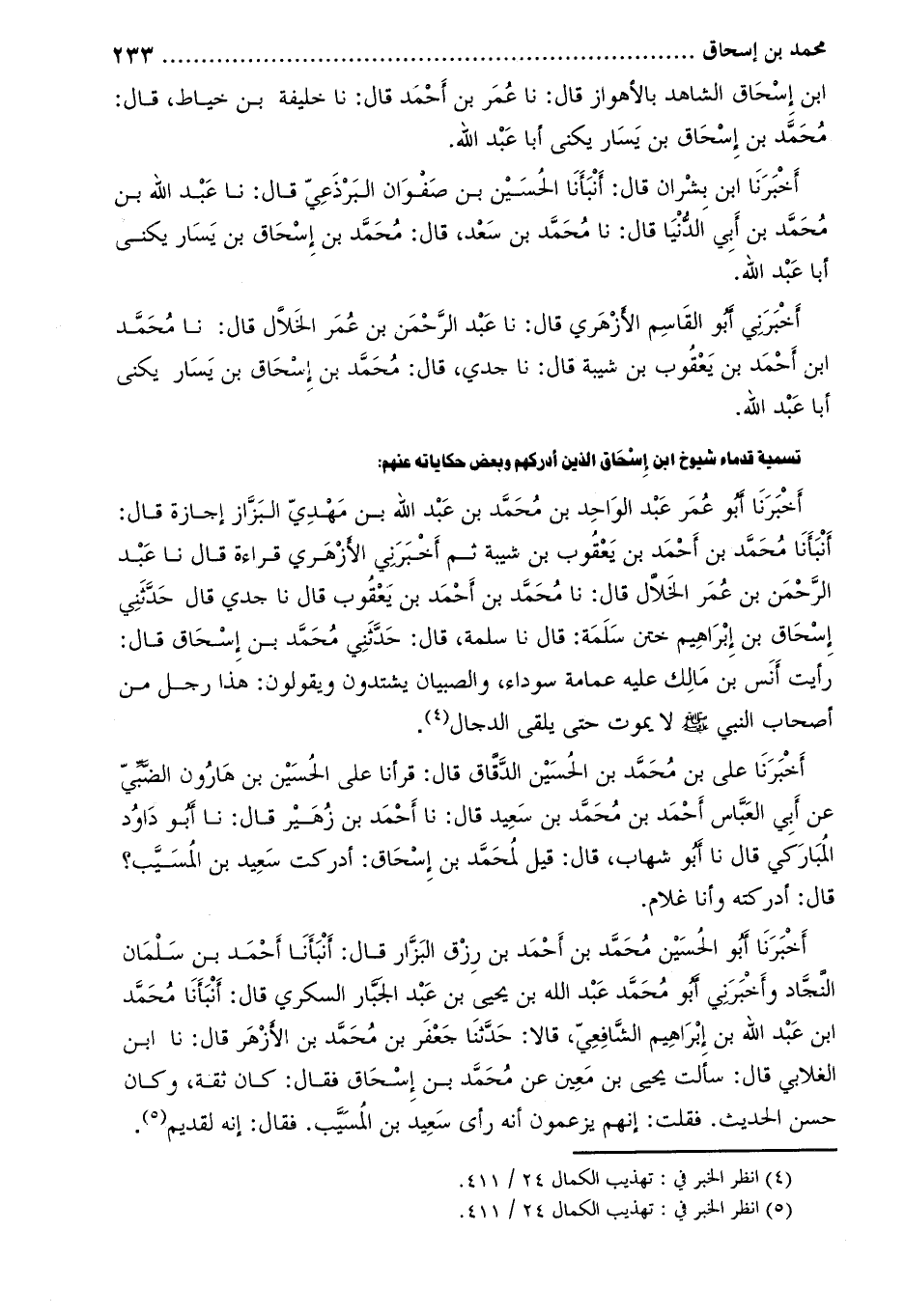 أَخْبَرَنِي أبو القاسم الأزهري قال: نا عبد الرّحمن بن عمر الخلّال قال: نا محمد ابن أَحْمَدَ بْنِ يَعْقُوب بن شيبه قَالَ: نا جدي، قَالَ: محمد بن إسحاق بن يسار يكنى أبا عبد الله.