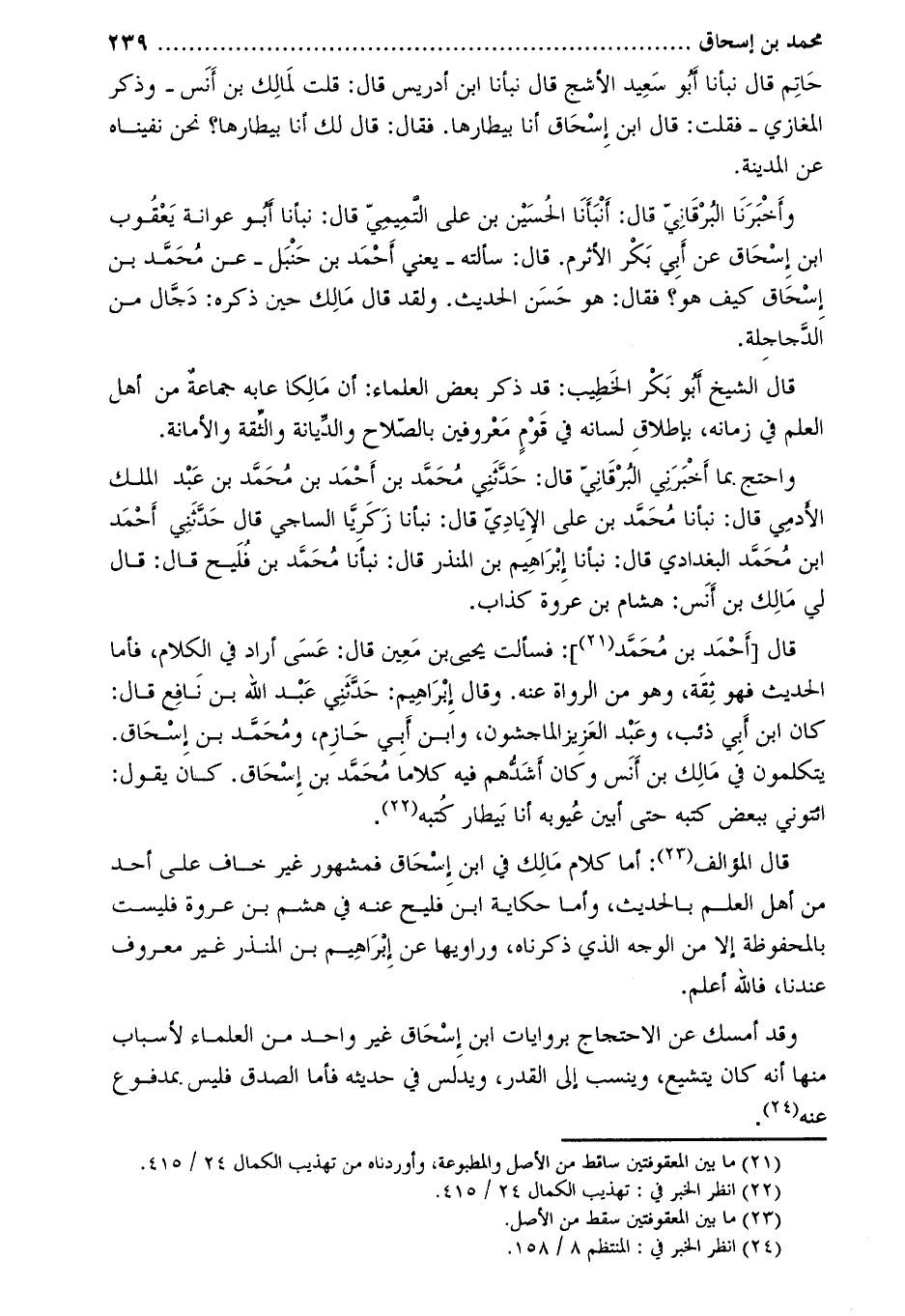 حاتم قال نبأنا أبو سعيد الأشج قال نبأنا ابن إدريس قَالَ: قلت لمالك بن أنس- وذكر المغازي- فقلت: قَالَ ابن إسحاق أنا بيطارها. فقال: قَالَ لك أنا بيطارها؟ نحن نفيناه عن المدينة.