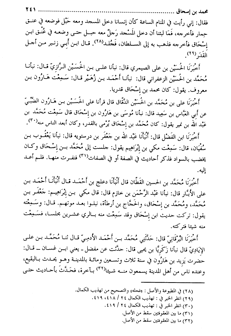 أَخْبَرَنَا الحسين بن علي الصيمري قال: نبأنا على بن الحسين الرّازيّ قال: نبأنا محمّد بن الحسين الزعفراني قال: نبأنا أَحْمَد بْن زهير قَالَ: سمعتُ هارون بْن معروف. يقول: كان محمد بن إسحاق قدريا.