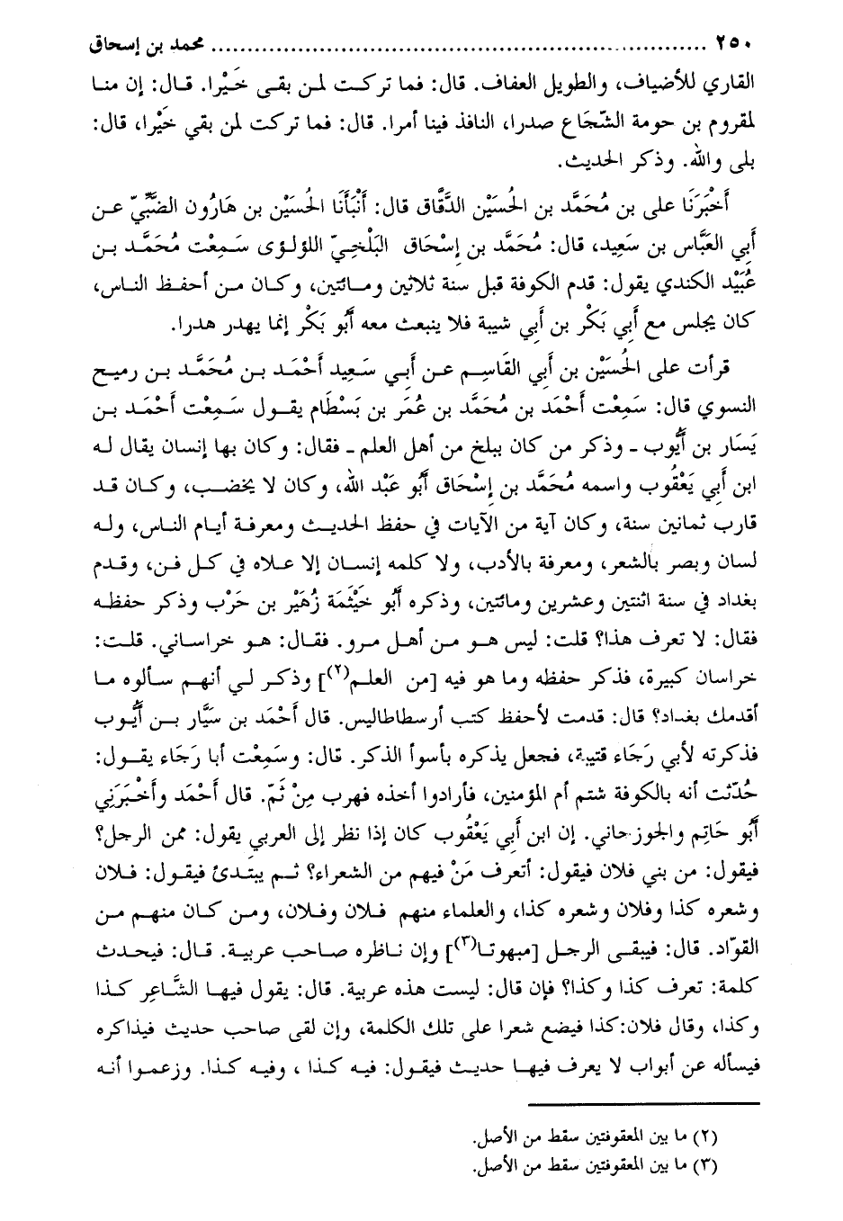 قرأت على الحسين بْن أَبِي الْقَاسِم عَنْ أَبِي سَعِيد أَحْمَد بْن مُحَمَّد بْن رميح النسوي قَالَ: سَمِعْتُ أَحْمَد بْن مُحَمَّد بْن عُمَر بْن بسطام يقول سمعت أحمد بن يسار بن أيوب- وذكر من كان ببلخ من أهل العلم- فقال: وكان بها إنسان يقال له ابن أبي يعقوب واسمه محمد بن إسحاق أبو عبد الله، وكان لا يخضب، وكان قد قارب ثمانين سنة، وكان آية من الآيات في حفظ الحديث ومعرفة أيام الناس، وله لسان وبصر بالشعر، ومعرفة بالأدب، ولا كلمه إنسان إلا علاه في كل فن، وقدم بغداد في سنة اثنتين وعشرين ومائتين، وذكره أبو خيثمة زهير بن حرب وذكر حفظه فقال: لا تعرف هذا؟ قلت: ليس هو من أهل مرو. فقال: هو خراساني. قلت: