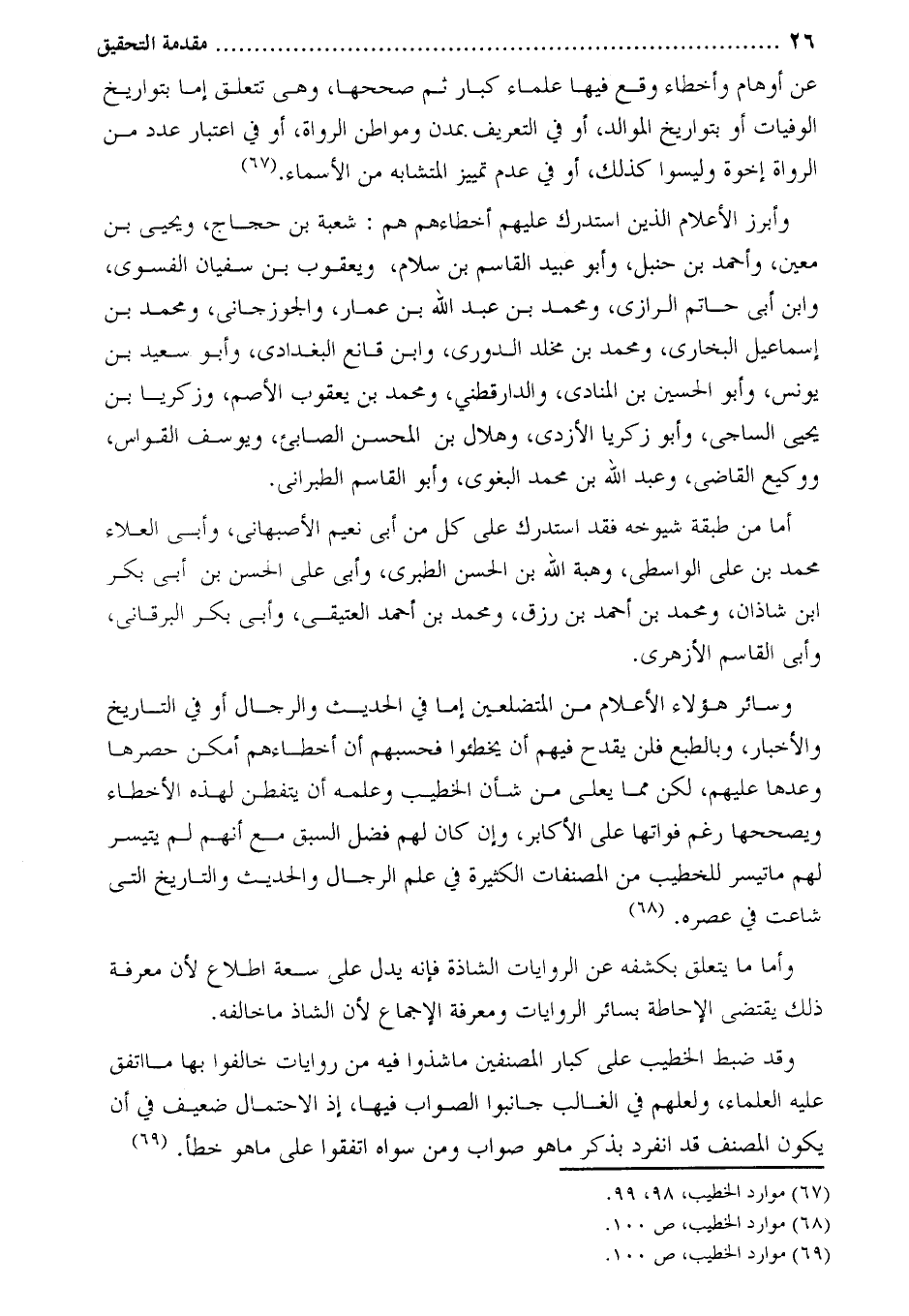وسائر هؤلاء الأعلام من المتضلعين إما في الحديث والرجال أو في التاريخ والأخبار، وبالطبع فلن يقدح فيهم أن يخطئوا فحسبهم أن أخطاءهم أمكن حصرها وعدها عليهم، لكن مما يعلى من شأن الخطيب وعلمه أن يتفطن لهذه الأخطاء ويصححها رغم فواتها على الأكابر، وإن كان لهم فضل السبق مع أنهم لم يتيسر لهم ما تيسر للخطيب من المصنفات الكثيرة في علم الرجال والحديث والتاريخ التي شاعت في عصره. [2]