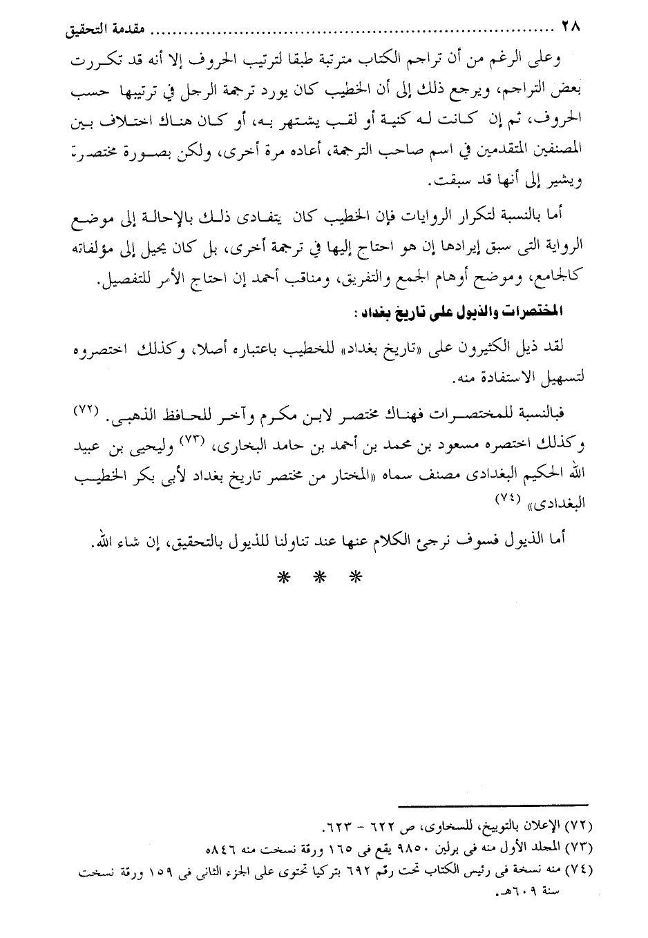 وكذلك اختصره مسعود بن محمد بن أحمد بن حامد البخاري، [2] وليحيى بن عبيد الله الحكيم البغدادي مصنف سماه «المختار من مختصر تاريخ بغداد لأبى بكر الخطيب البغدادي» [3] أما الذيول فسوف نرجئ الكلام عنها عند تناولنا للذيول بالتحقيق، إن شاء الله.