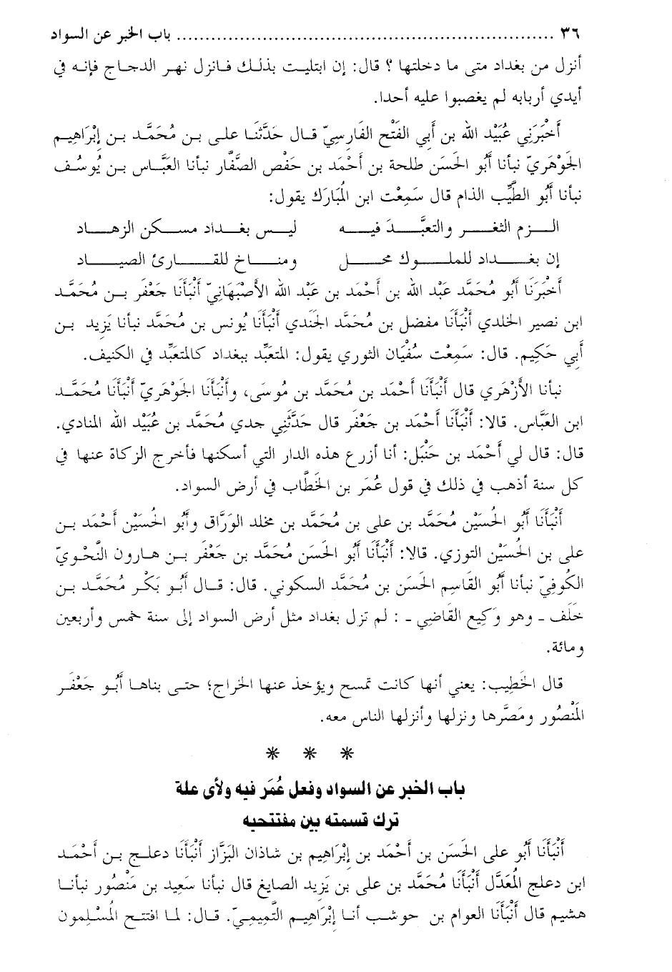 أنبأنا أَبُو الْحُسَيْنِ مُحَمَّدُ بْنُ عَلِيِّ بْنِ مُحَمَّدِ بْن مخلد الوراق وأبو الْحُسَيْنِ أَحْمَدُ بْن عَلِيِّ بْن الْحُسَيْنِ التَّوَّزِيُّ. قالا: أنبأنا أَبُو الْحَسَن مُحَمَّد بْن جعفر بْن هارون النّحويّ الكوفيّ نبأنا أَبُو القاسم الْحَسَن بْن محمد السكوني. قَالَ: قَالَ أَبُو بكر محمد بْن خلف- وهو وكيع الْقَاضِي-: لم تزل بغداد مثل أرض السواد إلى سنة خمس وأربعين ومائة.
