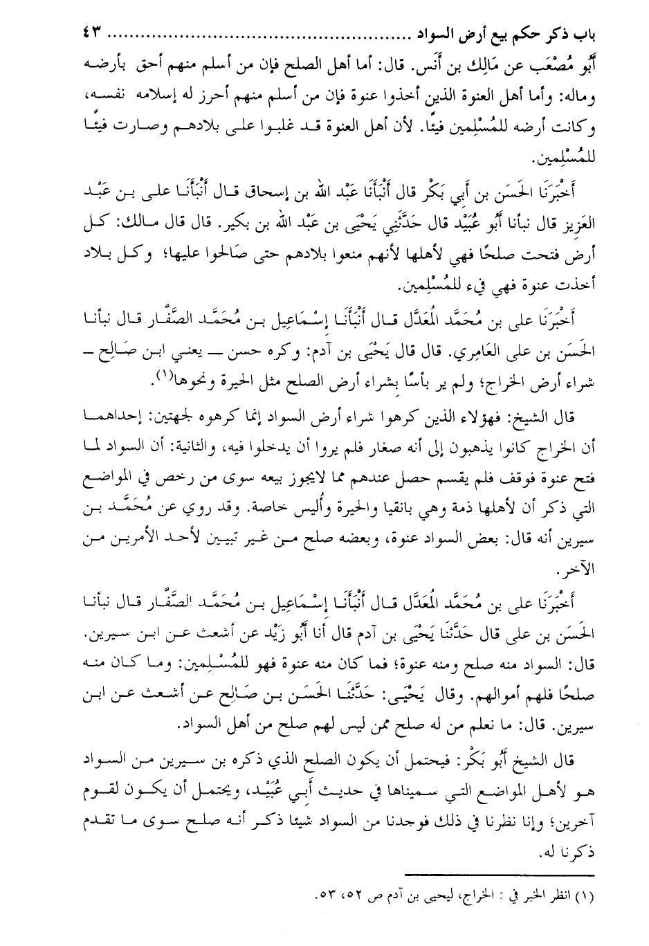 أَخْبَرَنَا عَلِيّ بْن مُحَمَّد المعدل قَالَ أنبأنا إسماعيل بن محمّد الصّفّار قال نبأنا الْحَسَن بْن عَلِيّ العامري. قَالَ قَالَ يحيى بْن آدم: وكره حسن- يَعْنِي ابْنَ صالح- شراء أرض الخراج؛ ولم ير بأسا بشراء أرض الصلح مثل الحيرة ونحوها [1] .