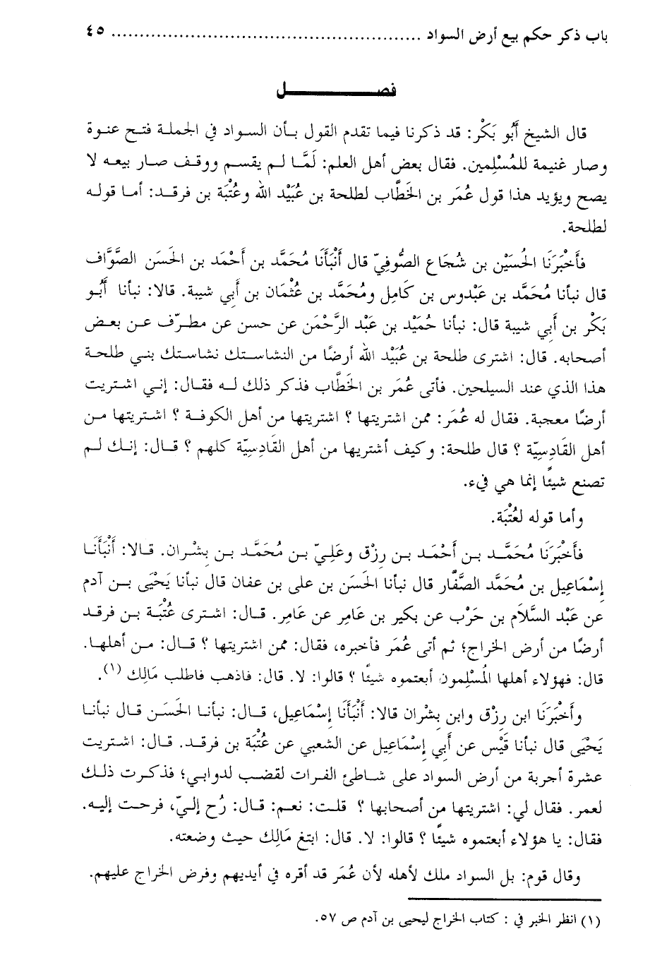فَأَخْبَرَنَا الْحُسَيْنُ بن شجاع الصّوفيّ قال أنبأنا محمد بن أحمد بن الحسن الصواف قال نبأنا محمد بن عبدوس بن كامل ومُحَمَّد بن عثمان بن أبي شيبة. قالا: نبأنا أبو بكر بن أبي شيبة قال: نبأنا حُمَيْدُ بْنُ عَبْدِ الرَّحْمَنِ عَنْ حَسَنٍ عَنْ مُطَرِّفٍ عَنْ بَعْضِ أَصْحَابِهِ. قَالَ: اشْتَرَى طَلْحَةُ بْنُ عُبَيْدِ اللَّهِ أَرْضًا مِنَ النّشَاستك نشَاستك بَنِي طَلْحَةَ هَذَا الَّذِي عِنْدَ السَّيْلَحِينَ. فَأَتَى عُمَرَ بْنَ الْخَطَّابِ فَذَكَرَ ذَلِكَ لَهُ فَقَالَ: إِنِّي اشْتَرَيْتُ أَرْضًا مُعْجَبَةً. فَقَالَ لَهُ عُمَرُ: مِمَّنِ اشْتَرَيْتَهَا؟ اشْتَرَيْتُهَا مِنْ أَهْلِ الْكُوفَةِ؟ اشْتَرَيْتَهَا مِنْ أَهْلِ الْقَادِسِيَّةِ؟ قَالَ طَلْحَةُ: وَكَيْفَ أَشْتَرِيهَا مِنْ أَهْلِ الْقَادِسِيَّةِ كُلِّهِمْ؟ قَالَ: إِنَّكَ لَمْ تَصْنَعْ شَيْئًا إِنَّمَا هِيَ فَيْءٌ.