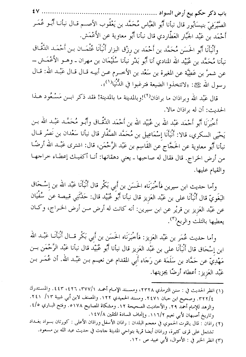وأما حديث ابْن سيرين فأخبرناه الْحَسَن بْن أَبِي بكر قال أنبأنا عبد الله بن إسحاق البغويّ قال أنبأنا على بن عبد العزيز قال نبأنا أَبُو عبيد قَالَ: حَدَّثَنِي قبيصة عَنْ سفيان عَنْ عَبْد العزيز بْن قرير عَنِ ابن سيرين: إنه كانت له أرض من أرض الخراج، وكان يعطيها بالثلث والربع [3] .
