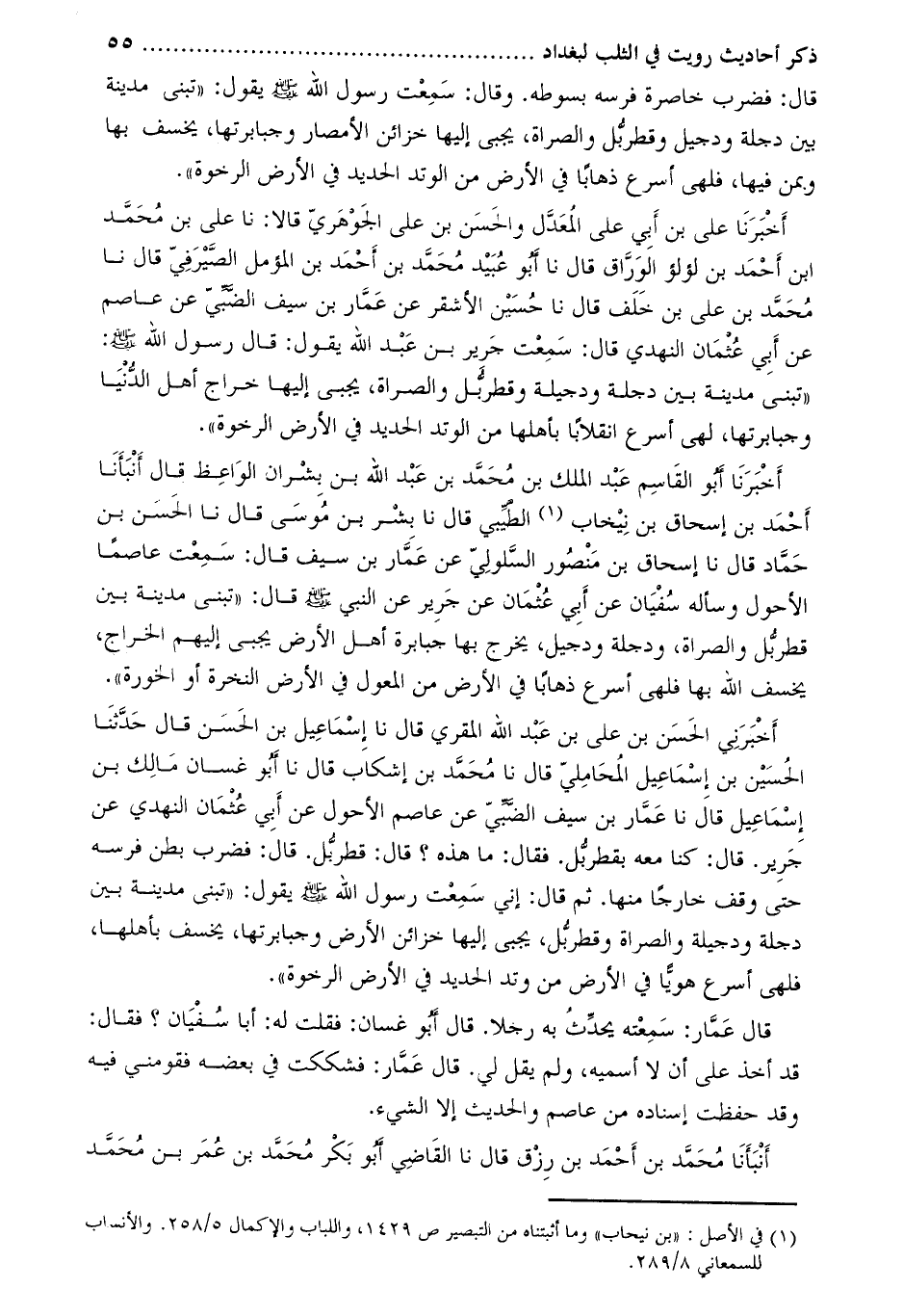 . أَخْبَرَنِي الْحَسَنُ بْنُ عَلِيِّ بْنِ عَبْدِ اللَّهِ المقري قال نا إسماعيل بن الحسن قَالَ حَدَّثَنَا الْحُسَيْنُ بْنُ إِسْمَاعِيلَ الْمَحَامِلِيُّ قَالَ نا محمّد بن إشكاب قال نا أبو غسان مالك بن إسماعيل قال نا عَمَّارُ بْنُ سَيْفٍ الضَّبِّيُّ عَنْ عَاصِمٍ الأَحْوَلِ عَنْ أَبِي عُثْمَانَ النَّهْدِيِّ عَنْ جَرِيرٍ. قَالَ: كُنَّا مَعَهُ بِقُطْرُبُّلَ. فَقَالَ: مَا هَذِهِ؟ قَالَ: قُطْرُبُّلُ. قَالَ: فَضَرَبَ بَطْنَ فَرَسِهِ حَتَّى وَقَفَ خَارِجًا مِنْهَا. ثُمَّ قَالَ: إِنِّي سَمِعْتُ رَسُولَ اللَّهِ صَلَّى اللَّهُ عَلَيْهِ وَسَلَّمَ يَقُولُ: «تُبْنَى مدينة بين دجلة ودجيلة وَالصَّرَاةِ وَقُطْرُبُّلَ، يُجْبَى إِلَيْهَا خَزَائِنُ الأَرْضِ وَجَبَابِرَتُهَا، يُخْسَفُ بِأَهْلِهَا، فَلَهِيَ أَسْرَعُ هَوِيًّا فِي الأَرْضِ مِنْ وَتَدِ الْحَدِيدِ فِي الأَرْضِ الرَّخْوَةِ»