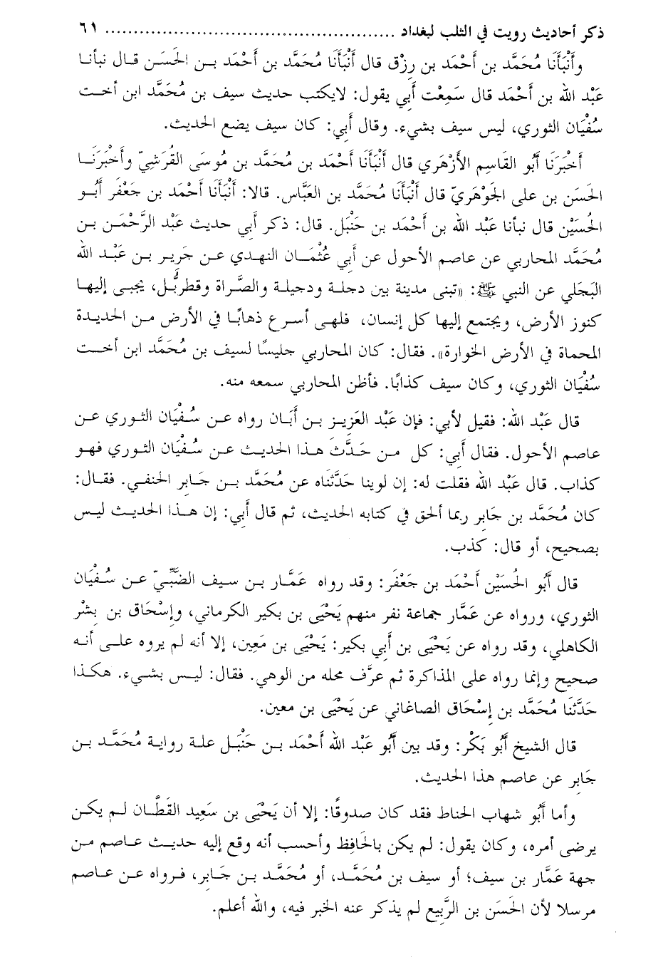 أَخْبَرَنَا أَبُو القاسم الأزهري قَالَ أنبانا أَحْمَد بْن مُحَمَّد بْنِ مُوسَى الْقُرَشِيُّ وَأَخْبَرَنَا الحسن بن على الجوهريّ قال أنبأنا محمّد بن العبّاس. قالا: أنبأنا أحمد بن جعفر أبو الحسين قال نبأنا عَبْد اللَّه بْن أَحْمَد بْن حنبل. قَالَ: ذَكَرَ أَبِي حَدِيثَ عَبْدِ الرَّحْمَنِ بْنِ مُحَمَّدٍ الْمُحَارِبِيُّ عَنْ عَاصِمٍ الأَحْوَلِ عَنْ أَبِي عُثْمَانَ النَّهْدِيِّ عَنْ جَرِيرِ بْنِ عَبْدِ اللَّهِ الْبَجَلِيِّ عَنِ النَّبِيِّ صَلَّى اللَّهُ عَلَيْهِ وَسَلَّمَ: «تُبْنَى مَدِينَةٌ بين دجلة ودجيلة وَالصَّرَاةِ وَقُطْرُبُّلَ، يُجْبَى إِلَيْهَا كُنُوزُ الأَرْضِ، وَيَجْتَمِعُ إِلَيْهَا كُلَّ إِنْسَانٍ، فلَهِيَ أَسْرَعُ ذَهَابًا فِي الأَرْضِ مِنَ الْحَدِيدَةِ الْمُحَمَّاةِ فِي الأَرْضِ الْخَوَّارَةِ»