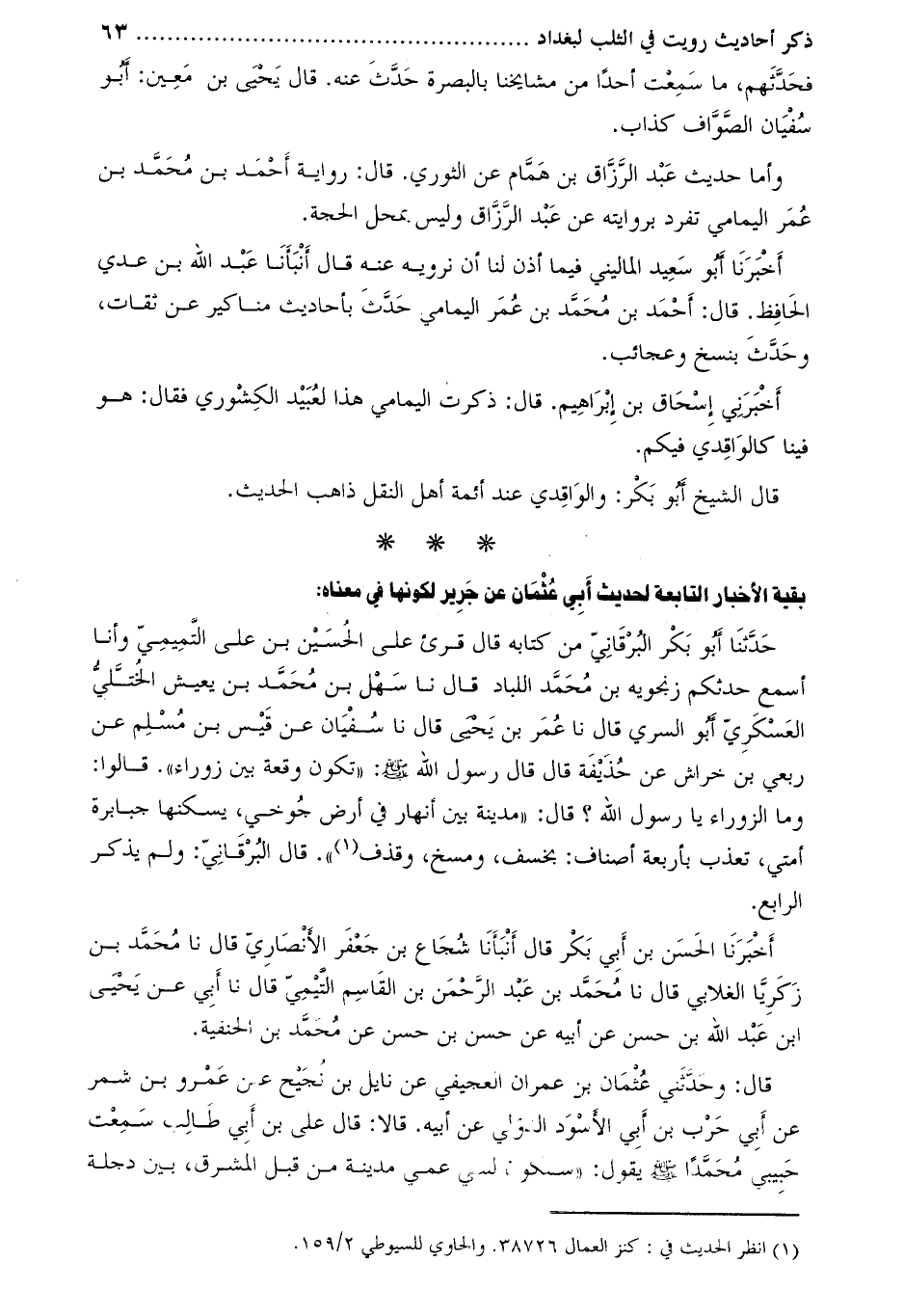 قَالَ: وَحَدَّثَنِي عُثْمَانُ بْنُ عِمْرَانَ الْعُجَيْفِيُّ عَنْ نائل بْنِ نَجِيحٍ عَنْ عَمْرِو بْنِ شَمْرٍ عَنْ أَبِي حَرْبِ بْنِ أَبِي الأَسْوَدِ الدُّؤَلِيِّ عَنْ أَبِيهِ. قَالا: قَالَ عَلِيُّ بْنُ أَبِي طَالِبٍ سَمِعْتُ حَبِيبِي مُحَمَّدًا صَلَّى اللَّهُ عَلَيْهِ وَسَلَّمَ يَقُولُ: «سَيَكُونُ لِبَنِي عَمِّي مَدِينَةٌ مِنْ قِبَلِ المشرق، بين دجلة