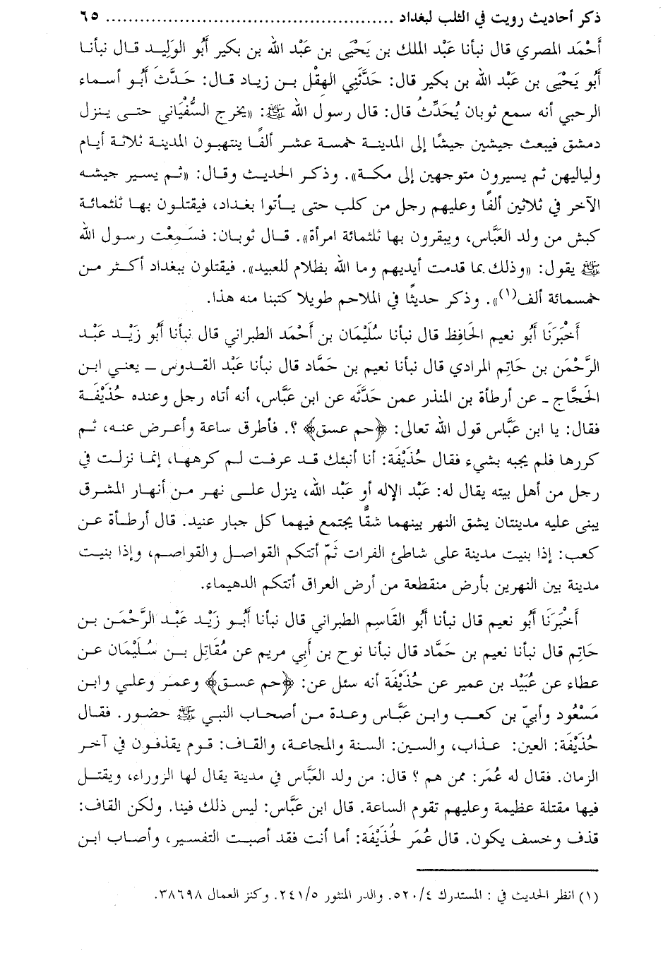 أحمد المصري قال نبأنا عَبْدُ الْمَلِكِ بْنُ يَحْيَى بْنِ عَبْدِ اللَّهِ بن بكير أبو الوليد قال نبأنا أبو يَحْيَى بْنُ عَبْدِ اللَّهِ بْنِ بُكَيْرٍ قَالَ: حدّثني الهقل بن زياد قَالَ: حَدَّثَ أَبُو أَسْمَاءَ الرَّحْبِيُّ أَنَّهُ سَمِعَ ثَوْبَانَ يُحَدِّثُ قَالَ: قَالَ رَسُولُ اللَّهِ صَلَّى اللَّهُ عَلَيْهِ وَسَلَّمَ: «يَخْرُجُ السُّفْيَانِيُّ حَتَّى يَنْزِلَ دِمَشْقَ فَيَبْعَثُ جَيْشَيْنِ جَيْشًا إِلَى الْمَدِينَةِ خَمْسَةَ عشر ألفا ينتهبون الْمَدِينَةَ ثَلاثَةَ أَيَّامٍ وَلَيَالِيَهُنَّ ثُمَّ يَسِيرُونَ مُتَوَجِّهِينَ إِلَى مَكَّةَ» . وَذَكَرَ الْحَدِيثَ وَقَالَ: «ثُمَّ يَسِيرُ جَيْشُهُ الآخَرُ فِي ثَلاثِينَ أَلْفًا وعَلَيْهِمْ رَجُلٌ مِنْ كَلْبٍ حَتَّى يَأْتُوا بَغْدَادَ، فَيَقْتُلُونَ بها ثلاثمائة كبش من ولد العبّاس، ويبقرون بها ثلاثمائة امْرَأَةٍ»