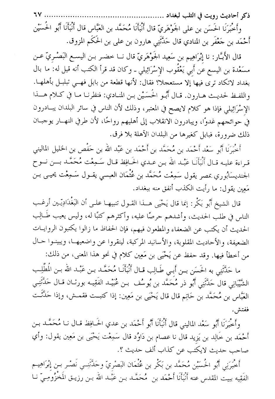 قال الشيخ أبو بكر: إنما قَالَ يحيي هذا القول تنبيها عَلى أن البغداديين أرغب الناس في طلب الحديث، وأشدهم حرصا عليه، وأكثرهم كتبا له، وليس يعيب طالب الحديث أن يكتب عَنِ الضعفاء والمطعون فيهم، فإن الحفاظ ما زالوا يكتبون الروايات الضعيفة، والأحاديث المقلوبة، والأسانيد المركبة، لينقروا عَنْ واضعيها، ويبينوا حال من أخطا فيها. وقد حفظ عَنْ يحيي بْن معين كلام في نحو هذا المعني، من ذلك: