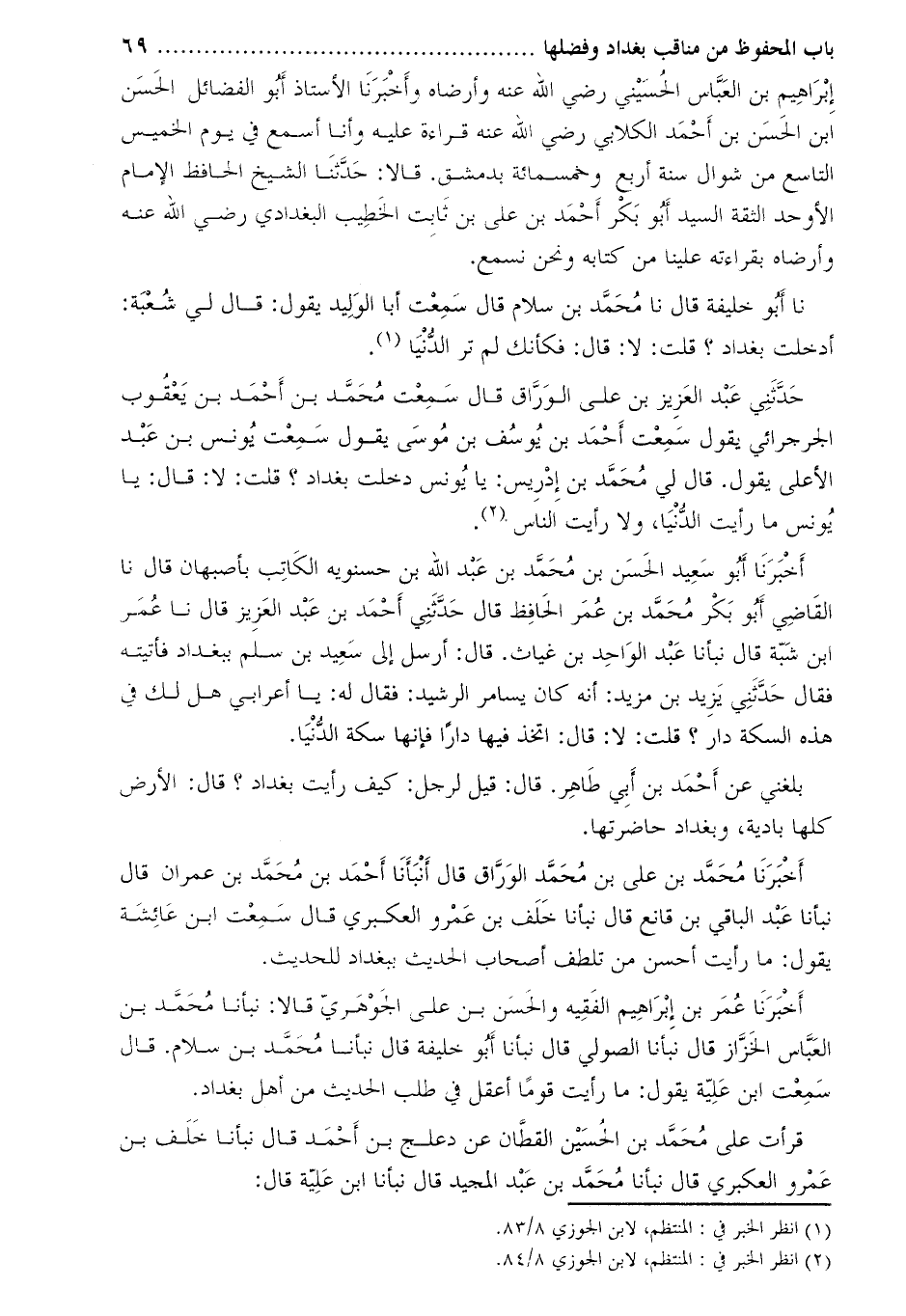 إبراهيم بن العبّاس الحسيني رضي الله عنه وأرضاه وأخبرنا الأستاذ أبو الفضائل الحسن ابن الحسن بن أحمد الكلابي رضي الله عنه قراءة عليه وأنا أسمع في يوم الخميس التاسع من شوال سنة أربع وخمسمائة بدمشق. قالا: حدّثنا الشيخ الحافظ الإمام الأوحد الثقة السيد أبو بكر أحمد بن علي بن ثابت الخطيب البغدادي رضي الله عنه وأرضاه بقراءته علينا من كتابه ونحن نسمع.