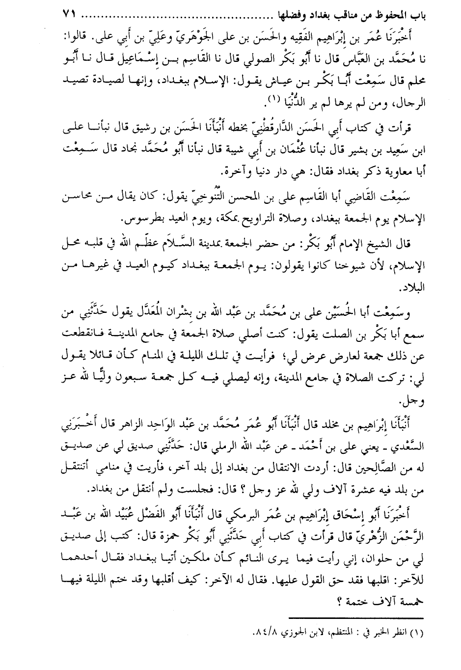 نا محمّد بن العبّاس قال نا أبو بكر الصولي قال نا القاسم بن إسماعيل قال نا أَبُو محلم قَالَ سَمِعْتُ أَبَا بَكْرِ بْن عَيَّاشٍ يَقُولُ: الإسلام ببغداد، وإنها لصيادة تصيد الرجال، ومن لم يرها لم ير الدنيا [1] .