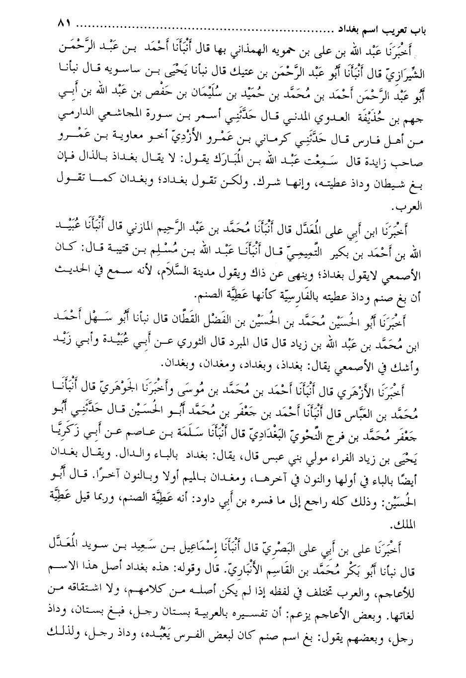 أَخْبَرَنَا عَبْد اللَّهِ بْن عَلِيّ بْن حمويه الهمذاني بها قال أنبأنا أحمد بن عبد الرّحمن الشّيرازيّ قال أنبأنا أبو عبد الرّحمن بن عتيك قال نبأنا يحيى بن ساسويه قال نبأنا أَبُو عَبْد الرَّحْمَنِ أَحْمَد بْن مُحَمَّد بْن حميد بْن سُلَيْمَان بْن حفص بْن عَبْدِ اللَّهِ بْن أَبِي جهم بْن حذيفة العدوي المدني قَالَ حَدَّثَنِي أسمر بْن سورة المجاشعي الدارمي من أهل فارس قَالَ حَدَّثَنِي كرماني بْن عمرو الأزدي أخو معاوية بْن عمرو صاحب زايدة قَالَ سمعت عَبْد اللَّهِ بْن المبارك يقول: لا يقال بغداذ بالذال فإن بغ شيطان وداذ عطيته، وإنها شرك. ولكن تقول بغداد؛ وبغدان كما تقول العرب.