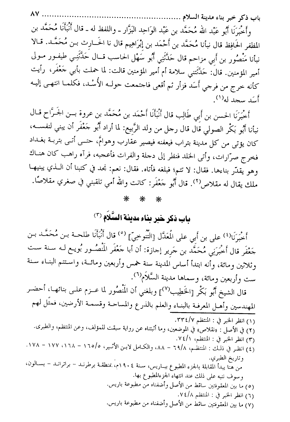 أَخْبَرَنَا [4] عَلِيّ بْن أبي على المعدّل [التّنوخيّ] [5] قال أنبأنا طلحة بْن مُحَمَّد بْن جَعْفَر قَالَ أَخْبَرَنِي مُحَمَّد بْن جرير إجازة: أن أبا جعفر المنصور بويع له سنة ست وثلاثين ومائة، وأنه ابتدأ أساس المدينة سنة خمس وأربعين ومائة، واستتم البناء سنة ست وأربعين ومائة، وسماها مدينة السّلام [6] .