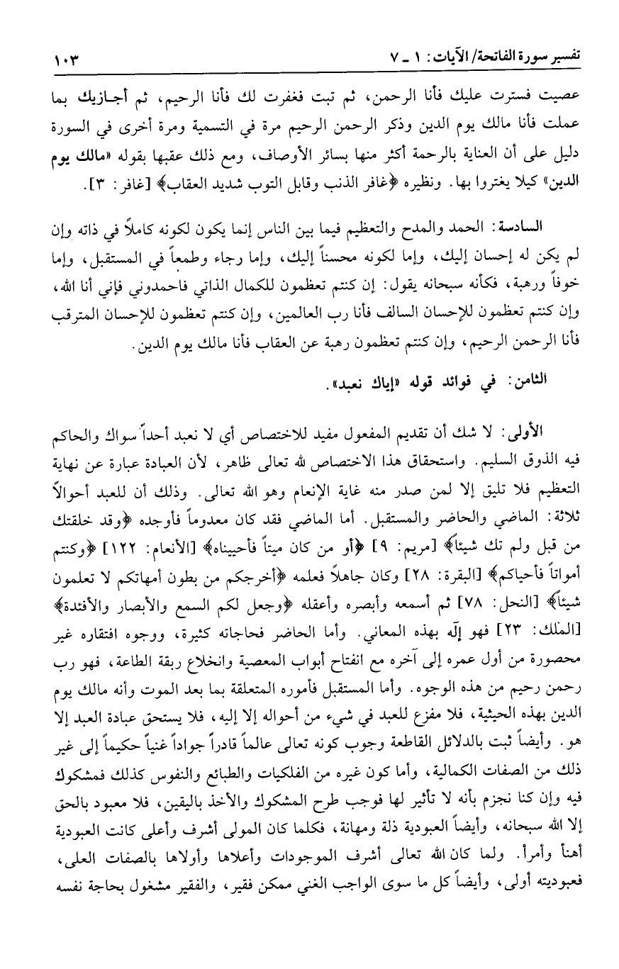 الأولى: لا شك أن تقديم المفعول مفيد للاختصاص أي لا نعبد أحدا سواك والحاكم فيه الذوق السليم. واستحقاق هذا الاختصاص لله تعالى ظاهر، لأن العبادة عبارة عن نهاية التعظيم فلا تليق إلا لمن صدر منه غاية الإنعام وهو الله تعالى. وذلك أن للعبد أحوالا ثلاثة: الماضي والحاضر والمستقبل. أما الماضي فقد كان معدوما فأوجده وَقَدْ خَلَقْتُكَ مِنْ قَبْلُ وَلَمْ تَكُ شَيْئاً [مريم: 9] أَوَمَنْ كانَ مَيْتاً فَأَحْيَيْناهُ [الأنعام: 122] وَكُنْتُمْ أَمْواتاً فَأَحْياكُمْ [البقرة: 28] وكان جاهلا فعلمه أَخْرَجَكُمْ مِنْ بُطُونِ أُمَّهاتِكُمْ لا تَعْلَمُونَ شَيْئاً [النحل: 78] ثم أسمعه وأبصره وأعقله وَجَعَلَ لَكُمُ السَّمْعَ وَالْأَبْصارَ وَالْأَفْئِدَةَ [الملك: 23] فهو إله بهذه المعاني. وأما الحاضر فحاجاته كثيرة، ووجوه افتقاره غير محصورة من أول عمره إلى آخره مع انفتاح أبواب المعصية وانخلاع ربقة الطاعة، فهو رب رحمن رحيم من هذه الوجوه. وأما المستقبل فأموره المتعلقة بما بعد الموت وأنه مالك يوم الدين بهذه الحيثية، فلا مفزع للعبد في شيء من أحواله إلا إليه، فلا يستحق عبادة العبد إلا هو. وأيضا ثبت بالدلائل القاطعة وجوب كونه تعالى عالما قادرا جوادا غنيا حكيما إلى غير ذلك من الصفات الكمالية، وأما كون غيره من الفلكيات والطبائع والنفوس كذلك فمشكوك فيه وإن كنا نجزم بأنه لا تأثير لها فوجب طرح المشكوك والأخذ باليقين، فلا معبود بالحق إلا الله سبحانه، وأيضا العبودية ذلة ومهانة، فكلما كان المولى أشرف وأعلى كانت العبودية أهنأ وأمرأ. ولما كان الله تعالى أشرف الموجودات وأعلاها وأولاها بالصفات العلى، فعبوديته أولى، وأيضا كل ما سوى الواجب الغني ممكن فقير، والفقير مشغول بحاجة نفسه
