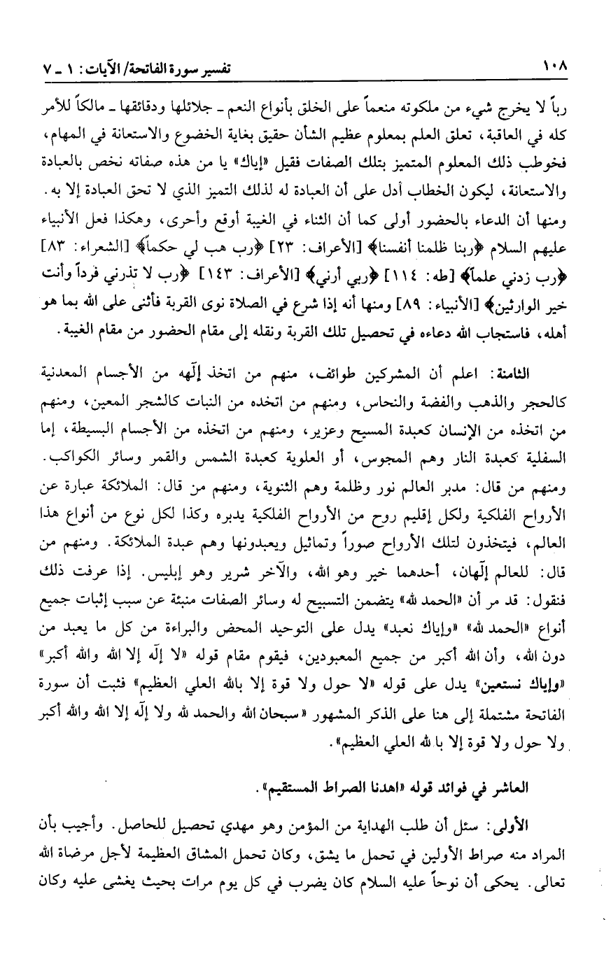 ومنهم من قال: مدبر العالم نور وظلمة وهم الثنوية، ومنهم من قال: الملائكة عبارة عن الأرواح الفلكية ولكل إقليم روح من الأرواح الفلكية يدبره وكذا لكل نوع من أنواع هذا العالم، فيتخذون لتلك الأرواح صورا وتماثيل ويعبدونها وهم عبدة الملائكة. ومنهم من قال: للعالم إلهان، أحدهما خير وهو الله، والآخر شرير وهو إبليس. إذا عرفت ذلك فنقول: قد مر أن «الحمد لله» يتضمن التسبيح له وسائر الصفات منبئة عن سبب إثبات جميع أنواع «الحمد لله» «وإياك نعبد» يدل على التوحيد المحض والبراءة من كل ما يعبد من دون الله، وأن الله أكبر من جميع المعبودين، فيقوم مقام قوله «لا إله إلا الله والله أكبر» «وإياك نستعين» يدل على قوله «لا حول ولا قوة إلا بالله العلي العظيم» فثبت أن سورة الفاتحة مشتملة إلى هنا على الذكر المشهور «سبحان الله والحمد لله ولا إله إلا الله والله أكبر ولا حول ولا قوة إلا بالله العلي العظيم» .