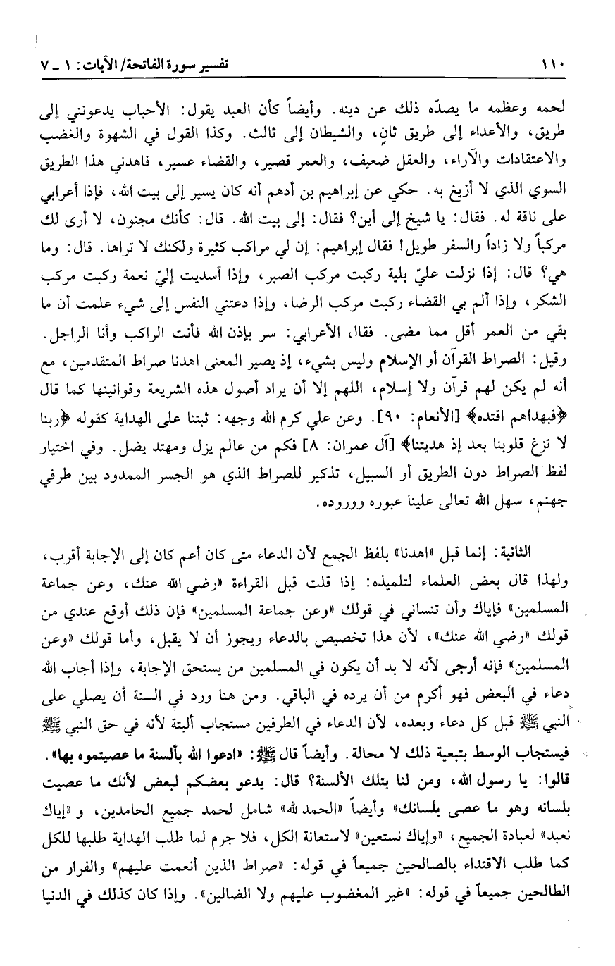 وأيضا كأن العبد يقول: الأحباب يدعونني إلى طريق، والأعداء إلى طريق ثان، والشيطان إلى ثالث. وكذا القول في الشهوة والغضب والاعتقادات والآراء، والعقل ضعيف، والعمر قصير، والقضاء عسير، فاهدني هذا الطريق السوي الذي لا أزيغ به. حكي عن إبراهيم بن أدهم أنه كان يسير إلى بيت الله، فإذا أعرابي على ناقة له. فقال: يا شيخ إلى أين؟ فقال: إلى بيت الله. قال: كأنك مجنون، لا أرى لك مركبا ولا زادا والسفر طويل! فقال إبراهيم: إن لي مراكب كثيرة ولكنك لا تراها. قال: وما هي؟ قال: إذا نزلت عليّ بلية ركبت مركب الصبر، وإذا أسديت إليّ نعمة ركبت مركب الشكر، وإذا ألم بي القضاء ركبت مركب الرضا، وإذا دعتني النفس إلى شيء علمت أن ما بقي من العمر أقل مما مضى. فقال الأعرابي: سر بإذن الله فأنت الراكب وأنا الراجل.