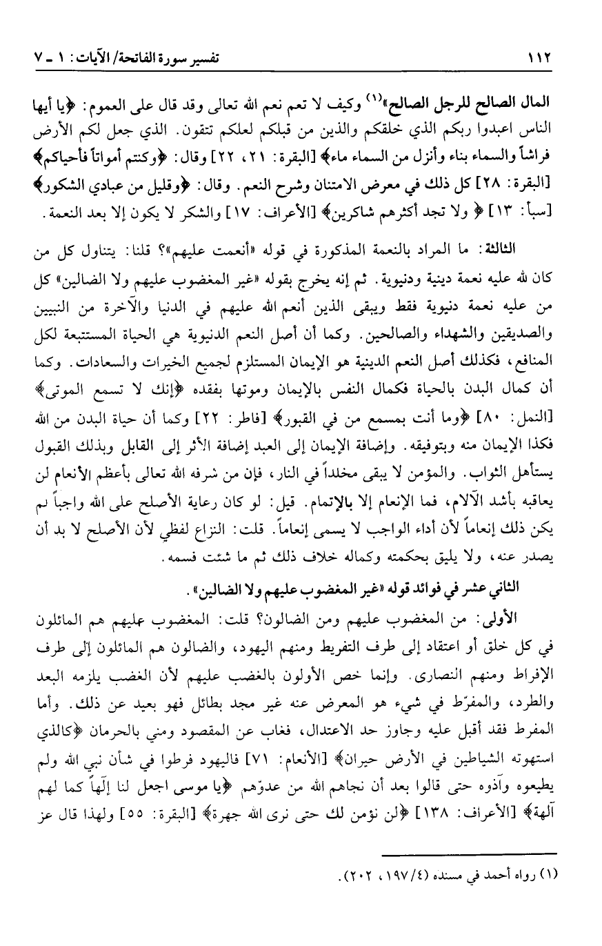 الثالثة: ما المراد بالنعمة المذكورة في قوله «أنعمت عليهم» ؟ قلنا: يتناول كل من كان لله عليه نعمة دينية ودنيوية. ثم إنه يخرج بقوله «غير المغضوب عليهم ولا الضالين» كل من عليه نعمة دنيوية فقط ويبقى الذين أنعم الله عليهم في الدنيا والآخرة من النبيين والصديقين والشهداء والصالحين. وكما أن أصل النعم الدنيوية هي الحياة المستتبعة لكل المنافع، فكذلك أصل النعم الدينية هو الإيمان المستلزم لجميع الخيرات والسعادات. وكما أن كمال البدن بالحياة فكمال النفس بالإيمان وموتها بفقده إِنَّكَ لا تُسْمِعُ الْمَوْتى [النمل: 80] وَما أَنْتَ بِمُسْمِعٍ مَنْ فِي الْقُبُورِ [فاطر: 22] وكما أن حياة البدن من الله فكذا الإيمان منه وبتوفيقه. وإضافة الإيمان إلى العبد إضافة الأثر إلى القابل وبذلك القبول يستأهل الثواب. والمؤمن لا يبقى مخلدا في النار، فإن من شرفه الله تعالى بأعظم الأنعام لن يعاقبه بأشد الآلام، فما الإنعام إلا بالإتمام. قيل: لو كان رعاية الأصلح على الله واجبا لم يكن ذلك إنعاما لأن أداء الواجب لا يسمى إنعاما. قلت: النزاع لفظي لأن الأصلح لا بد أن يصدر عنه، ولا يليق بحكمته وكماله خلاف ذلك ثم ما شئت فسمه.