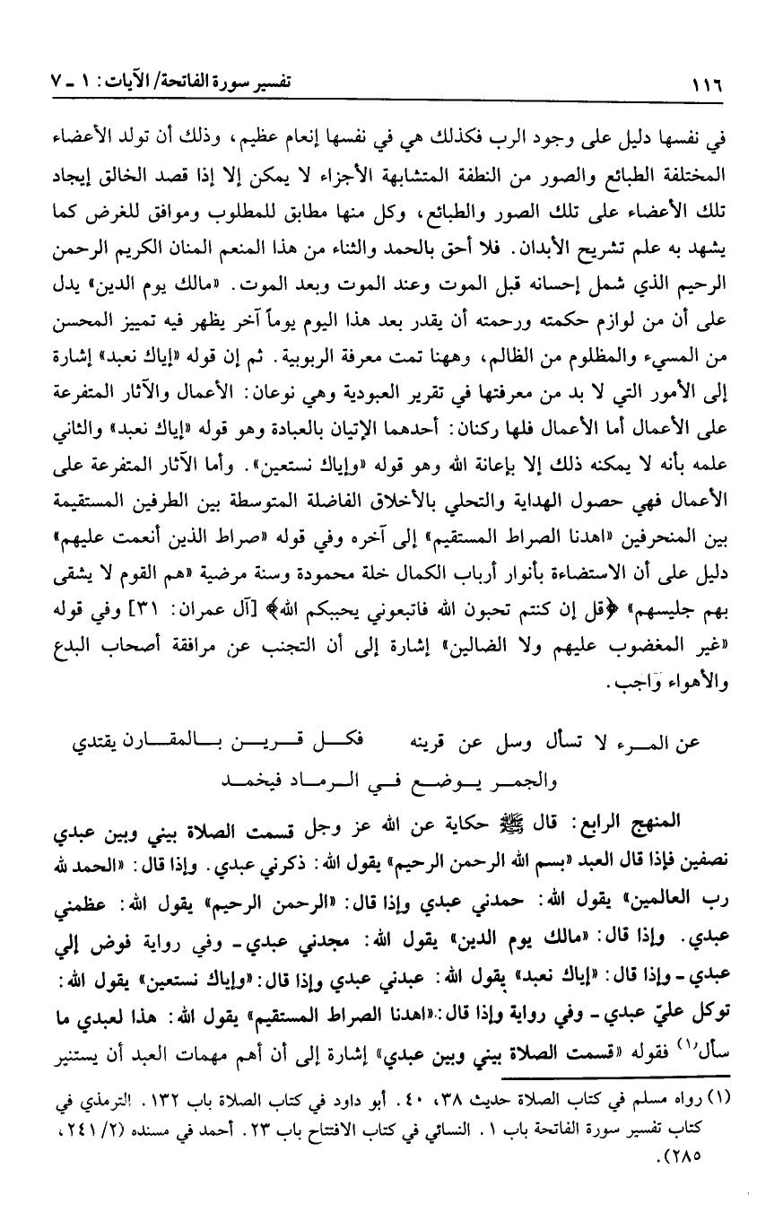 في نفسها دليل على وجود الرب فكذلك هي في نفسها إنعام عظيم، وذلك أن تولد الأعضاء المختلفة الطبائع والصور من النطفة المتشابهة الأجزاء لا يمكن إلا إذا قصد الخالق إيجاد تلك الأعضاء على تلك الصور والطبائع، وكل منها مطابق للمطلوب وموافق للغرض كما يشهد به علم تشريح الأبدان. فلا أحق بالحمد والثناء من هذا المنعم المنان الكريم الرحمن الرحيم الذي شمل إحسانه قبل الموت وعند الموت وبعد الموت. «مالك يوم الدين» يدل على أن من لوازم حكمته ورحمته أن يقدر بعد هذا اليوم يوما آخر يظهر فيه تمييز المحسن من المسيء والمظلوم من الظالم، وهاهنا تمت معرفة الربوبية. ثم إن قوله «إياك نعبد» إشارة إلى الأمور التي لا بد من معرفتها في تقرير العبودية وهي نوعان: الأعمال والآثار المتفرعة على الأعمال أما الأعمال فلها ركنان: أحدهما الإتيان بالعبادة وهو قوله «إياك نعبد» والثاني علمه بأنه لا يمكنه ذلك إلا بإعانة الله وهو قوله «وإياك نستعين» . وأما الآثار المتفرعة على الأعمال فهي حصول الهداية والتحلي بالأخلاق الفاضلة المتوسطة بين الطرفين المستقيمة بين المنحرفين «اهدنا الصراط المستقيم» إلى آخره وفي قوله «صراط الذين أنعمت عليهم» دليل على أن الاستضاءة بأنوار أرباب الكمال خلة محمودة وسنة مرضية «هم القوم لا يشقى بهم جليسهم» قُلْ إِنْ كُنْتُمْ تُحِبُّونَ اللَّهَ فَاتَّبِعُونِي يُحْبِبْكُمُ اللَّهُ [آل عمران: 31] وفي قوله «غير المغضوب عليهم ولا الضالين» إشارة إلى أن التجنب عن مرافقة أصحاب البدع والأهواء واجب.