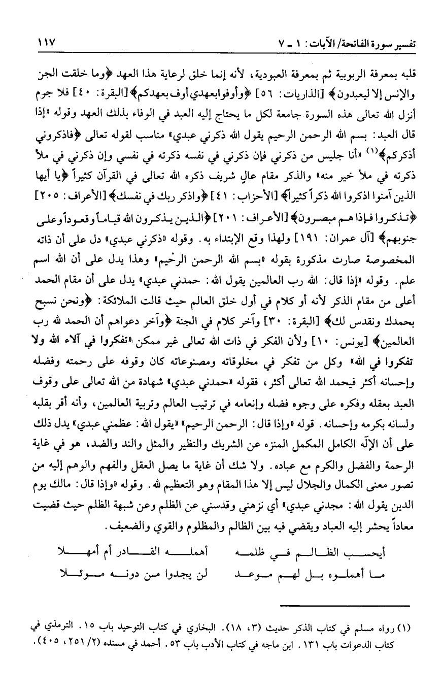قلبه بمعرفة الربوبية ثم بمعرفة العبودية، لأنه إنما خلق لرعاية هذا العهد وَما خَلَقْتُ الْجِنَّ وَالْإِنْسَ إِلَّا لِيَعْبُدُونِ [الذاريات: 56] وَأَوْفُوا بِعَهْدِي أُوفِ بِعَهْدِكُمْ [البقرة: 40] فلا جرم أنزل الله تعالى هذه السورة جامعة لكل ما يحتاج إليه العبد في الوفاء بذلك العهد