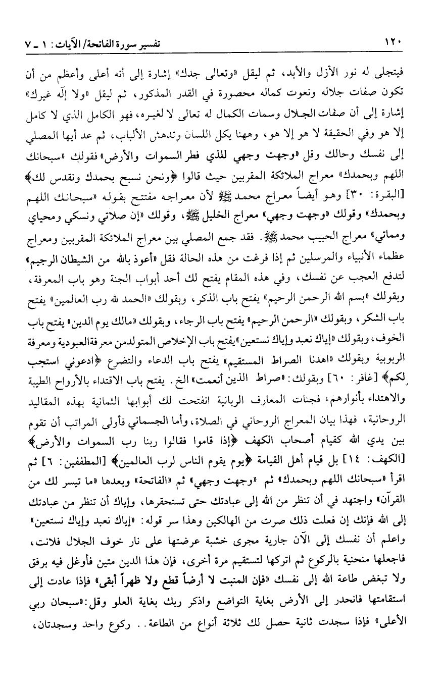 وقولك «وجهت وجهي» معراج الخليل صلى الله عليه وسلم، وقولك «إن صلاتي ونسكي ومحياي ومماتي» معراج الحبيب محمد صلى الله عليه وسلم. فقد جمع المصلي بين معراج الملائكة المقربين ومعراج عظماء الأنبياء والمرسلين ثم إذا فرغت من هذه الحالة فقل «أعوذ بالله من الشيطان الرجيم» لتدفع العجب عن نفسك، وفي هذه المقام يفتح لك أحد أبواب الجنة وهو باب المعرفة، وبقولك «بسم الله الرحمن الرحيم» يفتح باب الذكر، وبقولك «الحمد لله رب العالمين» يفتح باب الشكر، وبقولك «الرحمن الرحيم» يفتح باب الرجاء، وبقولك «مالك يوم الدين» يفتح باب الخوف، وبقولك «إياك نعبد وإياك نستعين» بفتح باب الإخلاص المتولد من معرفة العبودية ومعرفة الربوبية وبقولك «اهدنا الصراط المستقيم» يفتح باب الدعاء والتضرع ادْعُونِي أَسْتَجِبْ لَكُمْ [غافر: 60] وبقولك: «صراط الذين أنعمت» إلخ. يفتح باب الاقتداء بالأرواح الطيبة والاهتداء بأنوارهم، فجنات المعارف الربانية انفتحت لك أبوابها الثمانية بهذه المقاليد الروحانية، فهذا بيان المعراج الروحاني في الصلاة، وأما الجسماني فأولى المراتب أن تقوم بين يدي الله كقيام أصحاب الكهف إِذْ قامُوا فَقالُوا رَبُّنا رَبُّ السَّماواتِ وَالْأَرْضِ [الكهف: 14] بل قيام أهل القيامة يَوْمَ يَقُومُ النَّاسُ لِرَبِّ الْعالَمِينَ [المطففين: 6] ثم اقرأ «سبحانك اللهم وبحمدك» ثم «وجهت وجهي» ثم «الفاتحة» وبعدها «ما تيسر لك من القرآن» واجتهد في أن تنظر من الله إلى عبادتك حتى تستحقرها، وإياك أن تنظر من عبادتك إلى الله فإنك إن فعلت ذلك صرت من الهالكين وهذا سر قوله: «إياك نعبد وإياك نستعين» واعلم أن نفسك إلى الآن جارية مجرى خشبة عرضتها على نار خوف الجلال فلانت، فاجعلها منحنية بالركوع ثم اتركها لتستقيم مرة أخرى، فإن هذا الدين متين فأوغل فيه برفق ولا تبغض طاعة الله إلى نفسك
