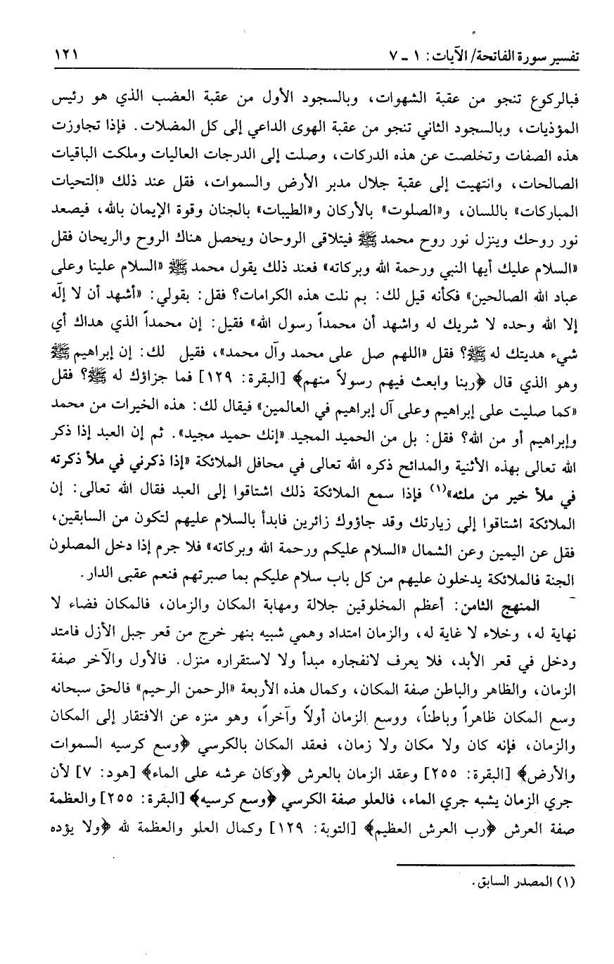 فبالركوع تنجو من عقبة الشهوات، وبالسجود الأول من عقبة العضب الذي هو رئيس المؤذيات، وبالسجود الثاني تنجو من عقبة الهوى الداعي إلى كل المضلات. فإذا تجاوزت هذه الصفات وتخلصت عن هذه الدركات، وصلت إلى الدرجات العاليات وملكت الباقيات الصالحات، وانتهيت إلى عقبة جلال مدبر الأرض والسموات، فقل عند ذلك «التحيات المباركات» باللسان، و «الصلوات» بالأركان و «الطيبات» بالجنان وقوة الإيمان بالله، فيصعد نور روحك وينزل نور روح محمد صلى الله عليه وسلم فيتلاقى الروحان ويحصل هناك الروح والريحان فقل «السلام عليك أيها النبي ورحمة الله وبركاته» فعند ذلك يقول محمد صلى الله عليه وسلم «السلام علينا وعلى عباد الله الصالحين» فكأنه قيل لك: بم نلت هذه الكرامات؟ فقل: بقولي: «أشهد أن لا إله إلا الله وحده لا شريك له واشهد أن محمدا رسول الله» فقيل: إن محمدا الذي هداك أي شيء هديتك له صلى الله عليه وسلم؟ فقل «اللهم صل على محمد وآل محمد» ، فقيل لك: إن إبراهيم صلى الله عليه وسلم وهو الذي قال رَبَّنا وَابْعَثْ فِيهِمْ رَسُولًا مِنْهُمْ [البقرة: 129] فما جزاؤك له صلى الله عليه وسلم؟ فقل «كما صليت على إبراهيم وعلى آل إبراهيم في العالمين» فيقال لك: هذه الخيرات من محمد وإبراهيم أو من الله؟ فقل: بل من الحميد المجيد «إنك حميد مجيد» . ثم إن العبد إذا ذكر الله تعالى بهذه الأثنية والمدائح ذكره الله تعالى في محافل الملائكة