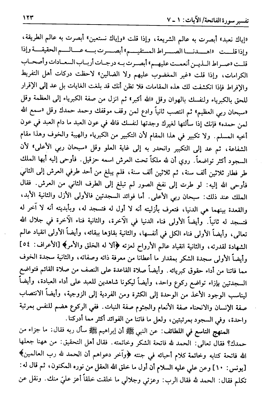«إياك نعبد» أبصرت به عالم الشريعة، وإذا قلت «وإياك نستعين» أبصرت به عالم الطريقة، وإذا قلت «اهدنا الصراط المستقيم» أبصرت به عالم الحقيقة وإذا قلت «صراط الذين أنعمت عليهم» أبصرت به درجات أرباب السعادات وأصحاب الكرامات، وإذا قلت «غير المغضوب عليهم ولا الضالين» لاحظت دركات أهل التفريط والإفراط فإذا انكشفت لك هذه المقامات فلا تظن أنك قد بلغت الغايات بل عد إلى الإقرار للحق بالكبرياء ولنفسك بالهوان وقل «الله أكبر» ثم انزل من صفة الكبرياء إلى العظمة وقل «سبحان ربي العظيم» ثم انتصب ثانيا وادع لمن وقف موقفك وحمد حمدك وقل «سمع الله لمن حمده» فإنك إذا سألتها لغيرك وجدتها لنفسك فالله في عون العبد ما دام العبد في عون أخيه المسلم. ولا تكبير في هذا المقام لأن التكبير من الكبرياء والهيبة والخوف وهذا مقام الشفاعة، ثم عد إلى التكبير وانحدر به إلى غاية العلو وقل «سبحان ربي الأعلى» لأن السجود أكثر تواضعا