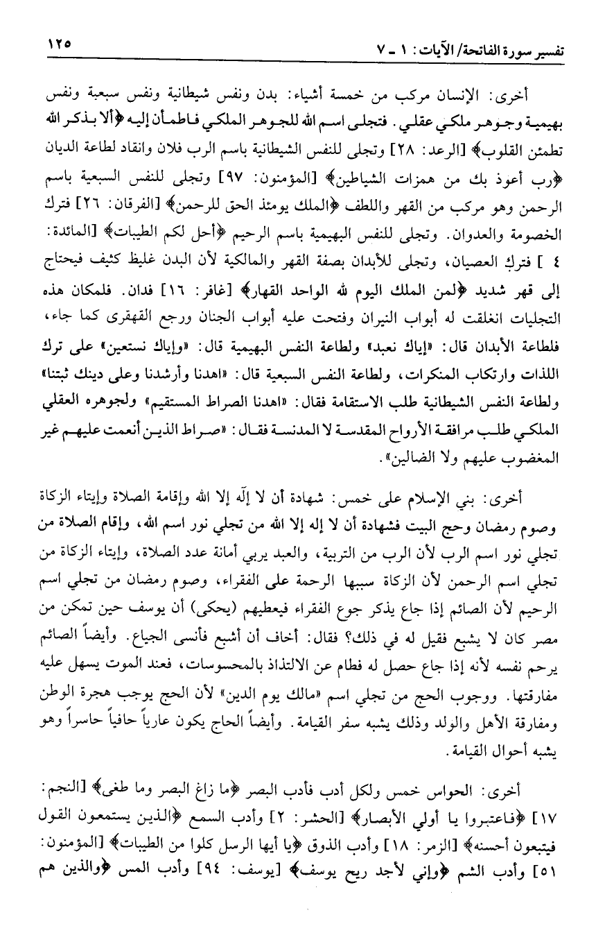 أخرى: بني الإسلام على خمس: شهادة أن لا إله إلا الله وإقامة الصلاة وإيتاء الزكاة وصوم رمضان وحج البيت فشهادة أن لا إله إلا الله من تجلي نور اسم الله، وإقام الصلاة من تجلي نور اسم الرب لأن الرب من التربية، والعبد يربي أمانة عدد الصلاة، وإيتاء الزكاة من تجلي اسم الرحمن لأن الزكاة سببها الرحمة على الفقراء، وصوم رمضان من تجلي اسم الرحيم لأن الصائم إذا جاع يذكر جوع الفقراء فيعطيهم (يحكى) أن يوسف حين تمكن من مصر كان لا يشبع فقيل له في ذلك؟ فقال: أخاف أن أشبع فأنسى الجياع. وأيضا الصائم يرحم نفسه لأنه إذا جاع حصل له فطام عن الالتذاذ بالمحسوسات، فعند الموت يسهل عليه مفارقتها. ووجوب الحج من تجلي اسم «مالك يوم الدين» لأن الحج يوجب هجرة الوطن ومفارقة الأهل والولد وذلك يشبه سفر القيامة. وأيضا الحاج يكون عاريا حافيا حاسرا وهو يشبه أحوال القيامة.