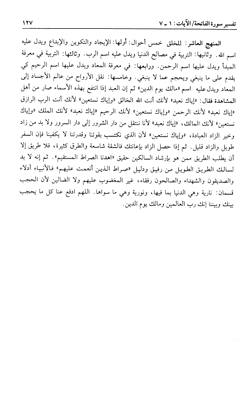المنهج العاشر: للخلق خمس أحوال: أولها: الإيجاد والتكوين والإبداع ويدل عليه اسم الله. وثانيها: التربية في مصالح الدنيا ويدل عليه اسم الرب. وثالثها: التربية في معرفة المبدأ ويدل عليها اسم الرحمن. ورابعها: في معرفة المعاد ويدل عليها اسم الرحيم كي يقدم على ما ينبغي ويحجم عما لا ينبغي. وخامسها: نقل الأرواح من عالم الأجساد إلى المعاد ويدل عليه اسم «مالك يوم الدين» ثم إن العبد إذا انتفع بهذه الأسماء صار من أهل المشاهدة فقال: «إياك نعبد» لأنك أنت الله الخالق «وإياك نستعين» لأنك أنت الرب الرازق «إياك نعبد» لأنك الرحمن «وإياك نستعين» لأنك الرحيم «إياك نعبد» لأنك الملك «وإياك نستعين» لأنك المالك، «إياك نعبد» لأنا ننتقل من دار الشرور إلى دار السرور ولا بد من زاد وخير الزاد العبادة، «وإياك نستعين» لأن الذي نكتسب بقوتنا وقدرتنا لا يكفينا فإن السفر طويل والزاد قليل. ثم إذا حصل الزاد بإعانتك فالشقة شاسعة والطرق كثيرة، فلا طريق إلا أن يطلب الطريق ممن هو بإرشاد السالكين حقيق «اهدنا الصراط المستقيم» . ثم إنه لا بد لسالك الطريق الطويل من رفيق ودليل «صراط الذين أنعمت عليهم» فالأنبياء أدلاء والصديقون والشهداء والصالحون رفقاء، غير المغضوب عليهم ولا الضالين لأن الحجب قسمان: نارية وهي الدنيا بما فيها، ونورية وهي ما سواها. اللهم ادفع عنا كل ما يحجب بينك وبيننا إنك رب العالمين ومالك يوم الدين.