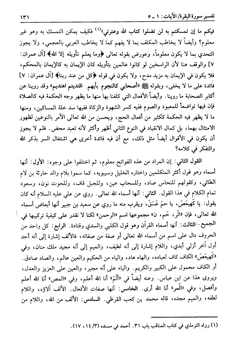 أو الكاف محمول على الكبير والكريم. والياء على أنه مجير، والعين على العزيز والعدل، ويروى هذا عن ابن عباس. وعنه أيضا في «ألم» أنا الله أعلم، وفي «المص» أنا الله أعلم وأفصل، وفي «المر» أنا الله أرى. الخامس: أنها صفات الأفعال. الألف آلاؤه، واللام لطفه، والميم مجده، قاله محمد بن كعب القرظي. السادس: الألف من الله، واللام من