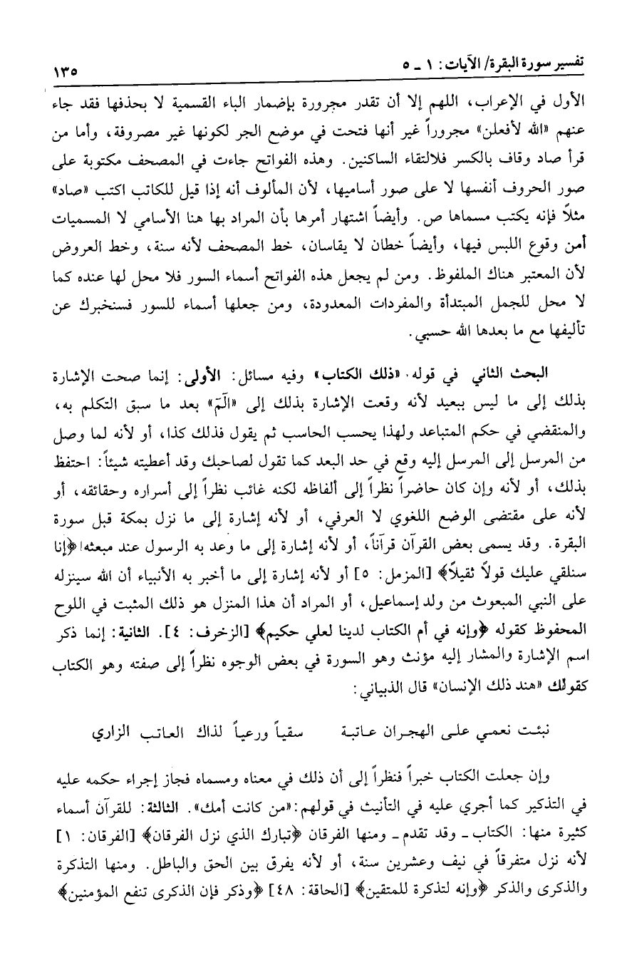 البحث الثاني في قوله. «ذلك الكتاب» وفيه مسائل: الأولى: إنما صحت الإشارة بذلك إلى ما ليس ببعيد لأنه وقعت الإشارة بذلك إلى «الم» بعد ما سبق التكلم به، والمنقضي في حكم المتباعد ولهذا يحسب الحاسب ثم يقول فذلك كذا، أو لأنه لما وصل من المرسل إلى المرسل إليه وقع في حد البعد كما تقول لصاحبك وقد أعطيته شيئا: احتفظ بذلك، أو لأنه وإن كان حاضرا نظرا إلى ألفاظه لكنه غائب نظرا إلى أسراره وحقائقه، أو لأنه على مقتضى الوضع اللغوي لا العرفي، أو لأنه إشارة إلى ما نزل بمكة قبل سورة البقرة. وقد يسمى بعض القرآن قرآنا، أو لأنه إشارة إلى ما وعد به الرسول عند مبعثه إِنَّا سَنُلْقِي عَلَيْكَ قَوْلًا ثَقِيلًا [المزمل: 5] أو لأنه إشارة إلى ما أخبر به الأنبياء أن الله سينزله على النبي المبعوث من ولد إسماعيل، أو المراد أن هذا المنزل هو ذلك المثبت في اللوح المحفوظ كقوله وَإِنَّهُ فِي أُمِّ الْكِتابِ لَدَيْنا لَعَلِيٌّ حَكِيمٌ [الزخرف: 4] . الثانية: إنما ذكر اسم الإشارة والمشار إليه مؤنث وهو السورة في بعض الوجوه نظرا إلى صفته وهو الكتاب كقولك «هند ذلك الإنسان» قال الذبياني: