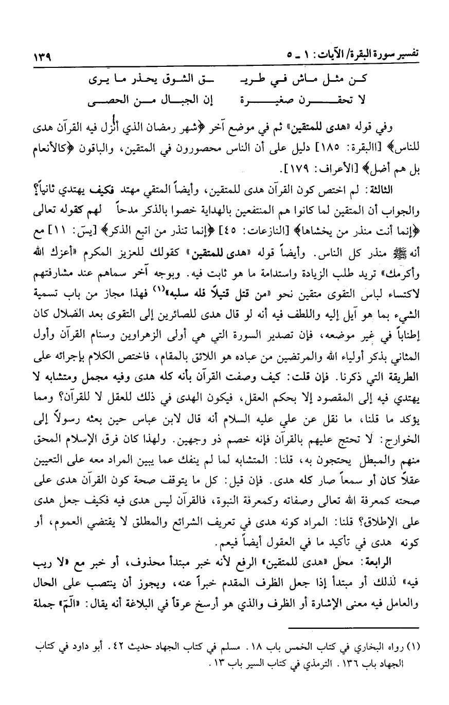 وفي قوله «هدى للمتقين» ثم في موضع آخر شَهْرُ رَمَضانَ الَّذِي أُنْزِلَ فِيهِ الْقُرْآنُ هُدىً لِلنَّاسِ [البقرة: 185] دليل على أن الناس محصورون في المتقين، والباقون كَالْأَنْعامِ بَلْ هُمْ أَضَلُّ [الأعراف: 179] .