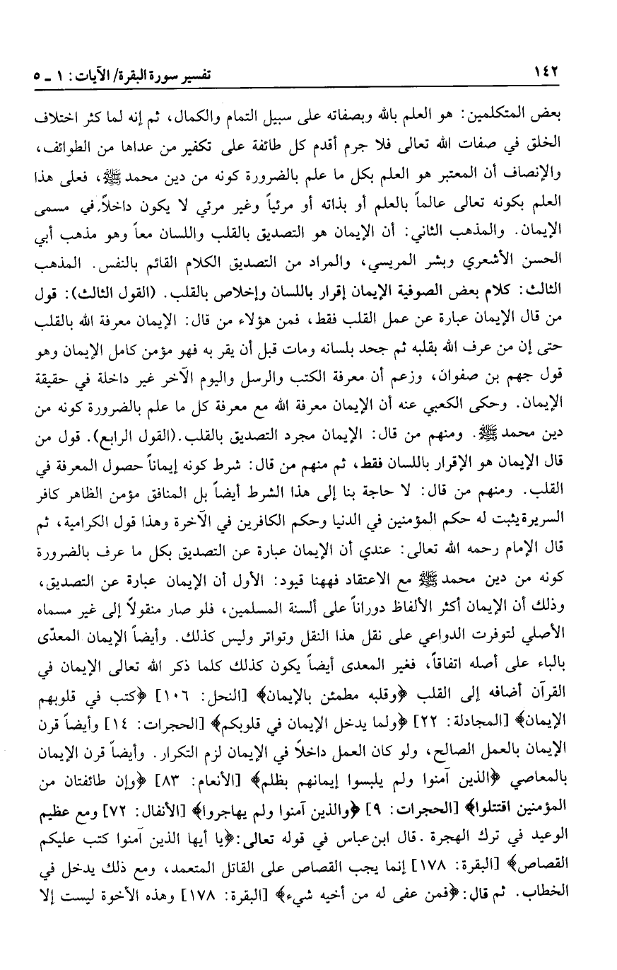 التصديق بكل ما عرف بالضرورة كونه من دين محمد صلى الله عليه وسلم مع الاعتقاد فههنا قيود: الأول أن الإيمان عبارة عن التصديق، وذلك أن الإيمان أكثر الألفاظ دورانا على ألسنة المسلمين، فلو صار منقولا إلى غير مسماه الأصلي لتوفرت الدواعي على نقل هذا النقل وتواتر وليس كذلك. وأيضا الإيمان المعدّى بالباء على أصله اتفاقا، فغير المعدى أيضا يكون كذلك كلما ذكر الله تعالى الإيمان في القرآن أضافه إلى القلب وَقَلْبُهُ مُطْمَئِنٌّ بِالْإِيمانِ [النحل: 106] كَتَبَ فِي قُلُوبِهِمُ الْإِيمانَ [المجادلة: 22] وَلَمَّا يَدْخُلِ الْإِيمانُ فِي قُلُوبِكُمْ [الحجرات: 14] وأيضا قرن الإيمان بالعمل الصالح، ولو كان العمل داخلا في الإيمان لزم التكرار. وأيضا قرن الإيمان بالمعاصي الَّذِينَ آمَنُوا وَلَمْ يَلْبِسُوا إِيمانَهُمْ بِظُلْمٍ [الأنعام: 83] وَإِنْ طائِفَتانِ مِنَ الْمُؤْمِنِينَ اقْتَتَلُوا [الحجرات: 9] وَالَّذِينَ آمَنُوا وَلَمْ يُهاجِرُوا [الأنفال: 72] ومع عظيم الوعيد في ترك الهجرة. قال ابن عباس في قوله تعالى: يا أَيُّهَا الَّذِينَ آمَنُوا كُتِبَ عَلَيْكُمُ الْقِصاصُ [البقرة: 178] إنما يجب القصاص على القاتل المتعمد، ومع ذلك يدخل في الخطاب. ثم قال: فَمَنْ عُفِيَ لَهُ مِنْ أَخِيهِ شَيْءٌ [البقرة: 178] وهذه الأخوة ليست إلا