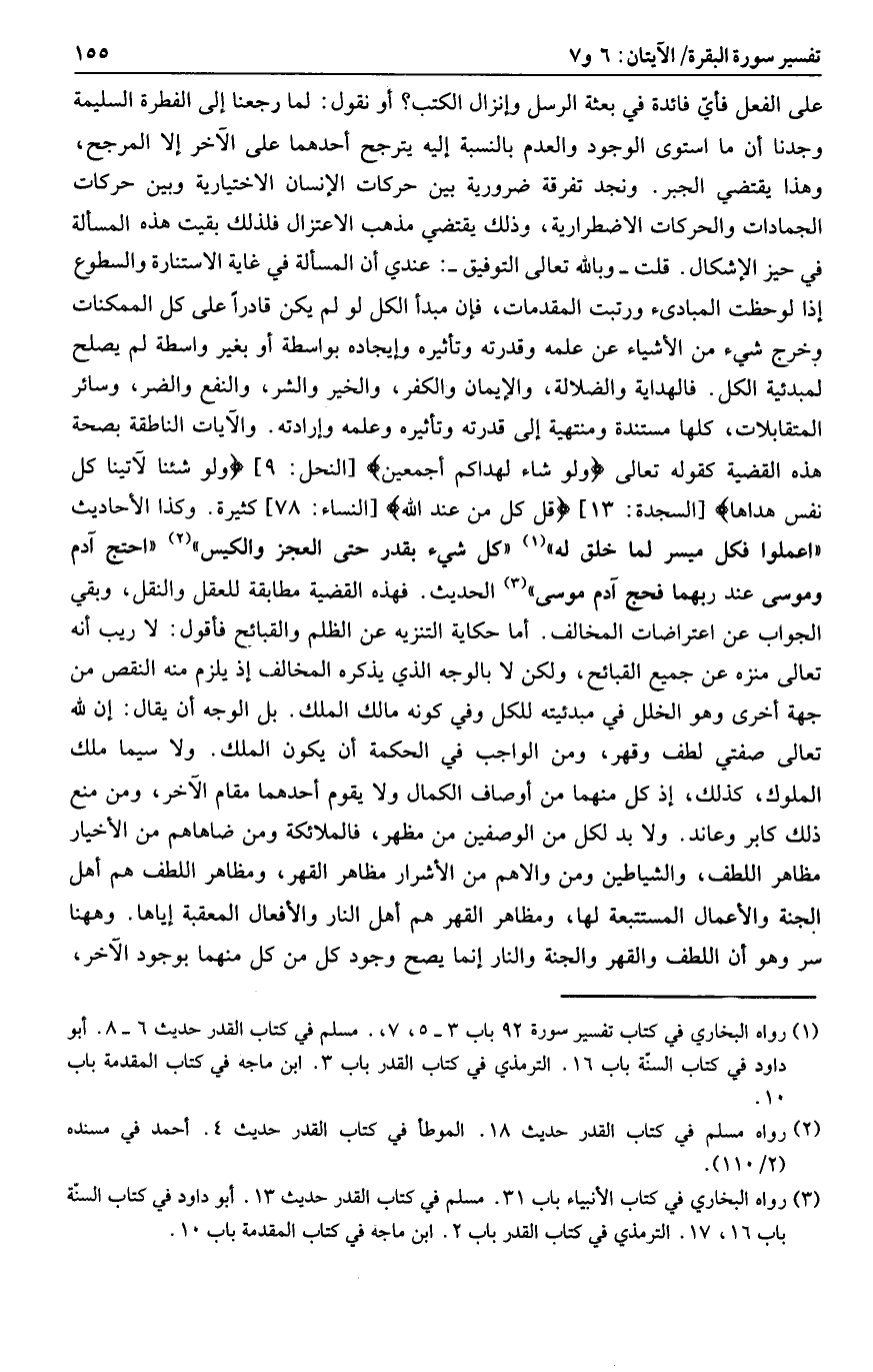 على الفعل فأيّ فائدة فائدة في بعثة الرسل وإنزال الكتب؟ أو نقول: لما رجعنا إلى الفطرة السليمة وجدنا أن ما استوى الوجود والعدم بالنسبة إليه يترجح أحدهما على الآخر إلا المرجح، وهذا يقتضي الجبر. ونجد تفرقة ضرورية بين حركات الإنسان الاختيارية وبين حركات الجمادات والحركات الاضطرارية، وذلك يقتضي مذهب الاعتزال فلذلك بقيت هذه المسألة في حيز الإشكال. قلت- وبالله تعالى التوفيق-: عندي أن المسألة في غاية الاستنارة والسطوع إذا لو حظت المبادئ ورتبت المقدمات، فإن مبدأ الكل لو لم يكن قادرا على كل الممكنات وخرج شيء من الأشياء عن علمه وقدرته وتأثيره وإيجاده بواسطة أو بغير واسطة لم يصلح لمبدئية الكل. فالهداية والضلالة، والإيمان والكفر، والخير والشر، والنفع والضر، وسائر المتقابلات، كلها مستندة ومنتهية إلى قدرته وتأثيره وعلمه وإرادته. والآيات الناطقة بصحة هذه القضية كقوله تعالى وَلَوْ شاءَ لَهَداكُمْ أَجْمَعِينَ [النحل: 9] وَلَوْ شِئْنا لَآتَيْنا كُلَّ نَفْسٍ هُداها [السجدة: 13] قُلْ كُلٌّ مِنْ عِنْدِ اللَّهِ [النساء: 78] كثيرة. وكذا