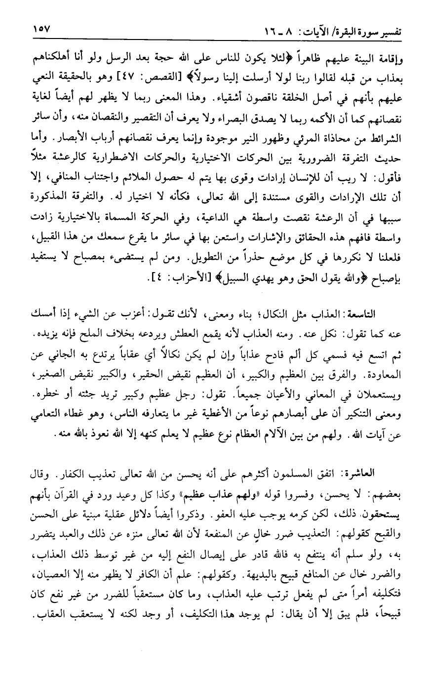 العاشرة: اتفق المسلمون أكثرهم على أنه يحسن من الله تعالى تعذيب الكفار. وقال بعضهم: لا يحسن، وفسروا قوله «ولهم عذاب عظيم» وكذا كل وعيد ورد في القرآن بأنهم يستحقون ذلك، لكن كرمه يوجب عليه العفو. وذكروا أيضا دلائل عقلية مبنية على الحسن والقبح كقولهم: التعذيب ضرر خال عن المنفعة لأن الله تعالى منزه عن ذلك والعبد يتضرر به، ولو سلم أنه ينتفع به فالله قادر على إيصال النفع إليه من غير توسط ذلك العذاب، والضرر خال عن المنافع قبيح بالبديهة. وكقولهم: علم أن الكافر لا يظهر منه إلا العصيان، فتكليفه أمرا متى لم يفعل ترتب عليه العذاب، وما كان مستعقبا للضرر من غير نفع كان قبيحا، فلم يبق إلا أن يقال: لم يوجد هذا التكليف، أو وجد لكنه لا يستعقب العقاب.