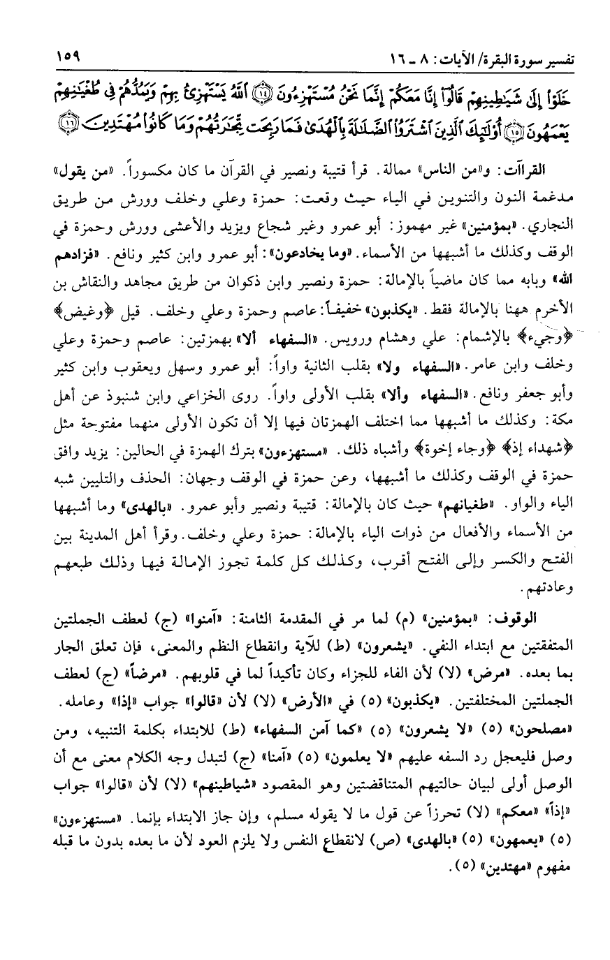 «مصلحون» (هـ) «لا يشعرون» (هـ) «كما آمن السفهاء» (ط) للابتداء بكلمة التنبيه، ومن وصل فليعجل رد السفه عليهم «لا يعلمون» (هـ) «آمنا» (ج) لتبدل وجه الكلام معنى مع أن الوصل أولى لبيان حالتيهم المتناقضتين وهو المقصود «شياطينهم» (لا) لأن «قالوا» جواب «إذا» «معكم» (لا) تحرزا عن قول ما لا يقوله مسلم، وإن جاز الابتداء بإنما. «مستهزءون» (هـ) «يعمهون» (هـ) «بالهدى» (ص) لانقطاع النفس ولا يلزم العود لأن ما بعده بدون ما قبله مفهوم «مهتدين» (هـ) .