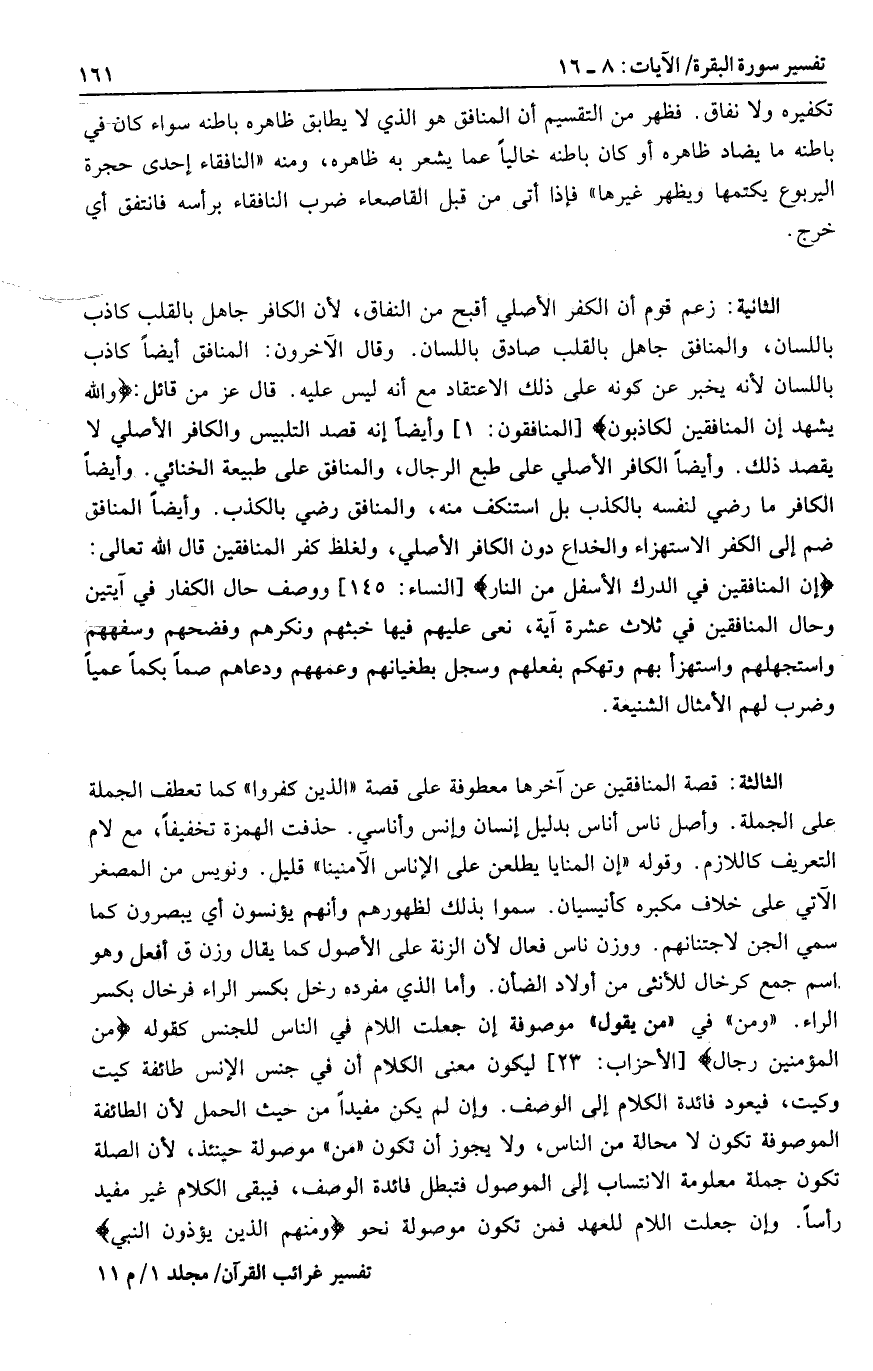 إِنَّ الْمُنافِقِينَ فِي الدَّرْكِ الْأَسْفَلِ مِنَ النَّارِ [النساء: 145] ووصف حال الكفار في آيتين وحال المنافقين في ثلاث عشرة آية، نعى عليهم فيها خبثهم ونكرهم وفضحهم وسفههم واستجهلهم واستهزأ بهم وتهكم بفعلهم وسجل بطغيانهم وعمههم ودعاهم صما بكما عميا وضرب لهم الأمثال الشنيعة.