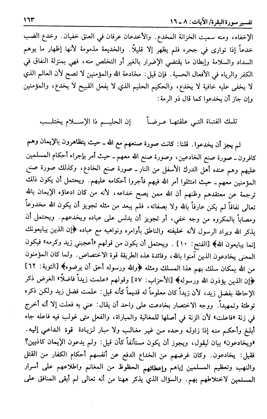 لم يجز أن يخدعوا. قلنا: كانت صورة صنعهم مع الله- حيث يتظاهرون بالإيمان وهم كافرون- صورة صنع الخادعين، وصورة صنع الله معهم- حيث أمر بإجراء أحكام المسلمين عليهم وهم عنده أهل الدرك الأسفل من النار- صورة صنع الخادع، وكذلك صورة صنع المؤمنين معهم- حيث امتثلوا أمر الله فيهم فأجروا أحكامه عليهم. ويحتمل أن يكون ذلك ترجمة عن معتقدهم وظنهم أن الله ممن يصح خداعه، لأنه من كان ادعاؤه الإيمان بالله تعالى نفاقا لم يكن عارفا بالله ولا بصفاته، فلم يبعد من مثله تجويز أن يكون الله مخدوعا ومصابا بالمكروه من وجه خفي، أو تجويز أن يدلس على عباده ويخدعهم. ويحتمل أن يذكر الله ويراد الرسول لأنه خليفته والناطق بأوامره ونواهيه مع عباده إِنَّ الَّذِينَ يُبايِعُونَكَ إِنَّما يُبايِعُونَ اللَّهَ [الفتح: 10] . ويحتمل أن يكون من قولهم «أعجبني زيد وكرمه» فيكون المعنى يخادعون الذين آمنوا بالله، وفائدة هذه الطريقة قوة الاختصاص. ولما كان المؤمنون من الله بمكان سلك بهم هذا المسلك ومثله وَاللَّهُ وَرَسُولُهُ أَحَقُّ أَنْ يُرْضُوهُ [التوبة: 62] إِنَّ الَّذِينَ يُؤْذُونَ اللَّهَ وَرَسُولَهُ [الأحزاب: 57] وقولهم «علمت زيدا فاضلا» الغرض ذكر الإحاطة بفضل زيد، لأن زيدا كان معلوما له قديما كأنه قيل: علمت فضل زيد ولكن ذكره توطئة وتمهيدا. ووجه الاختصار بخادعت على واحد أن يقال: عني به فعلت إلا أنه أخرج في زنة «فاعلت» لأن الزنة في أصلها للمغالبة والمباراة، والفعل متى غولب فيه فاعله جاء أبلغ وأحكم منه إذا زاوله وحده من غير مغالب ولا مبار لزيادة قوة الداعي إليه.