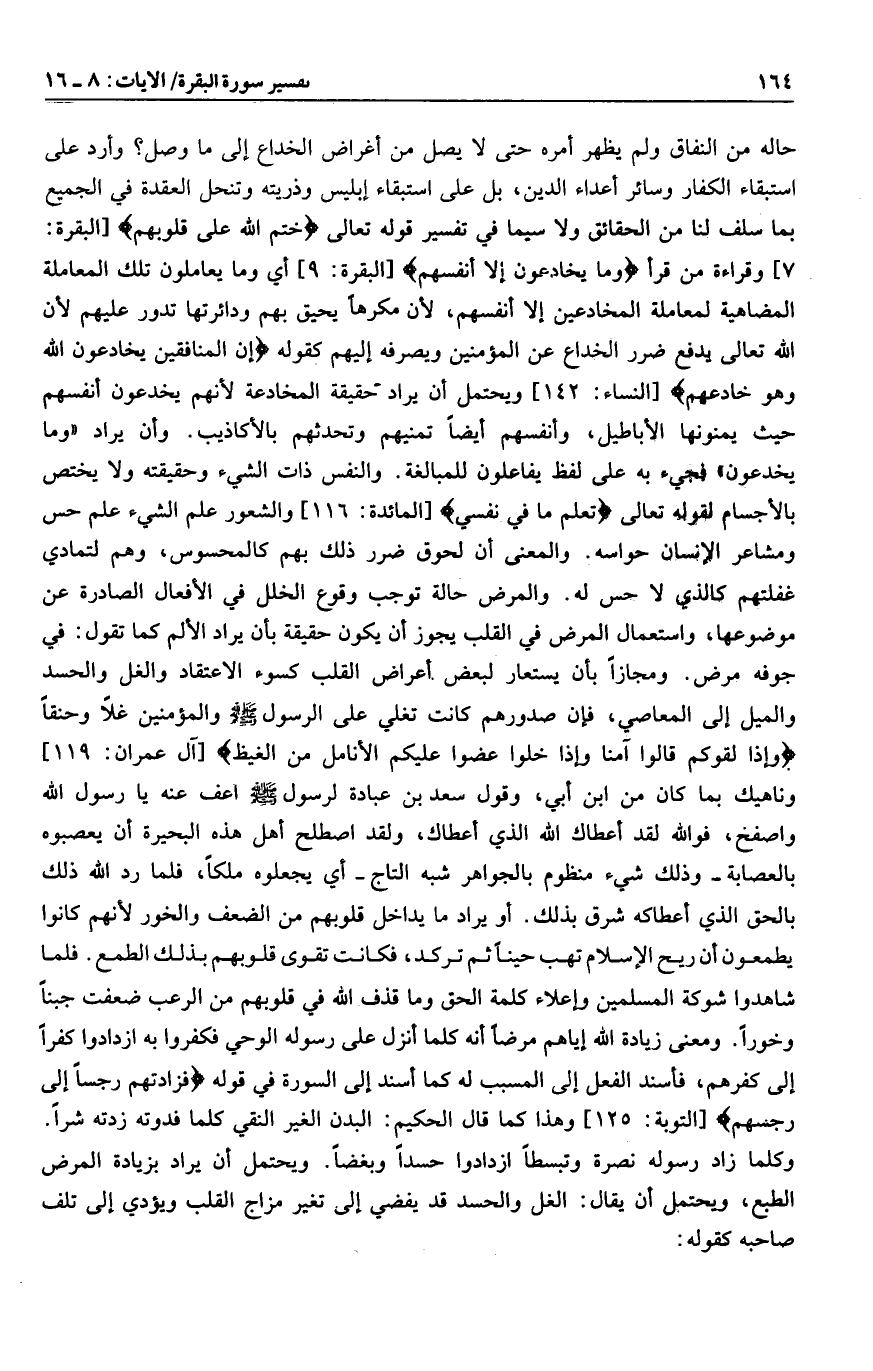 [النساء: 142] ويحتمل أن يراد حقيقة المخادعة لأنهم يخدعون أنفسهم حيث يمنونها الأباطيل، وأنفسهم أيضا تمنيهم وتحدثهم بالأكاذيب. وأن يراد «وما يخدعون» فجيء به على لفظ يفاعلون للمبالغة. والنفس ذات الشيء وحقيقته ولا يختص بالأجسام لقوله تعالى تَعْلَمُ ما فِي نَفْسِي [المائدة: 116] والشعور علم الشيء علم حس ومشاعر الإنسان حواسه. والمعنى أن لحوق ضرر ذلك بهم كالمحسوس، وهم لتمادي غفلتهم كالذي لا حس له. والمرض حالة توجب وقوع الخلل في الأفعال الصادرة عن موضوعها، واستعمال المرض في القلب يجوز أن يكون حقيقة بأن يراد الألم كما تقول: في جوفه مرض. ومجازا بأن يستعار لبعض أعراض القلب كسوء الاعتقاد والغل والحسد والميل إلى المعاصي، فإن صدورهم كانت تغلي على الرسول صلى الله عليه وسلم والمؤمنين غلا وحنقا وَإِذا لَقُوكُمْ قالُوا آمَنَّا وَإِذا خَلَوْا عَضُّوا عَلَيْكُمُ الْأَنامِلَ مِنَ الْغَيْظِ [آل عمران: 119] وناهيك بما كان من ابن أبي، وقول سعد بن عبادة لرسول صلى الله عليه وسلم اعف عنه يا رسول الله واصفح، فو الله لقد أعطاك الله الذي أعطاك، ولقد اصطلح أهل هذه البحيرة أن يعصبوه بالعصابة- وذلك شيء منظوم بالجواهر شبه التاج- أي يجعلوه ملكا، فلما رد الله ذلك بالحق الذي أعطاكه شرق بذلك. أو يراد ما يداخل قلوبهم من الضعف والخور لأنهم كانوا يطمعون أن ريح الإسلام تهب حينا ثم تركد، فكانت تقوى قلوبهم بذلك الطمع. فلما شاهدوا شوكة المسلمين وإعلاء كلمة الحق وما قذف الله في قلوبهم من الرعب ضعفت جبنا وخورا. ومعنى زيادة الله إياهم مرضا أنه كلما أنزل على رسوله الوحي فكفروا به ازدادوا كفرا إلى كفرهم، فأسند الفعل إلى المسبب له كما أسند إلى السورة في قوله فَزادَتْهُمْ رِجْساً إِلَى رِجْسِهِمْ [التوبة: 125] وهذا كما قال الحكيم: البدن الغير النقي كلما فدوته زدته شرا.