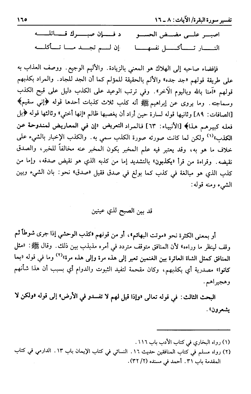 ولكن لما كانت صورته صورة الكذب سمي به. والكذب الإخبار بالشيء على خلاف ما هو به، وقد يعتبر فيه علم المخبر بكون المخبر عنه مخالفا للخبر، والصدق نقيضه. وقراءة من قرأ «يكذبون» بالتشديد إما من كذبه الذي هو نقيض صدقه، وإما من كذب الذي هو مبالغة في كذب كما بولغ في صدق فقيل «صدق» نحو: بان الشيء وبين الشيء ومنه قوله: