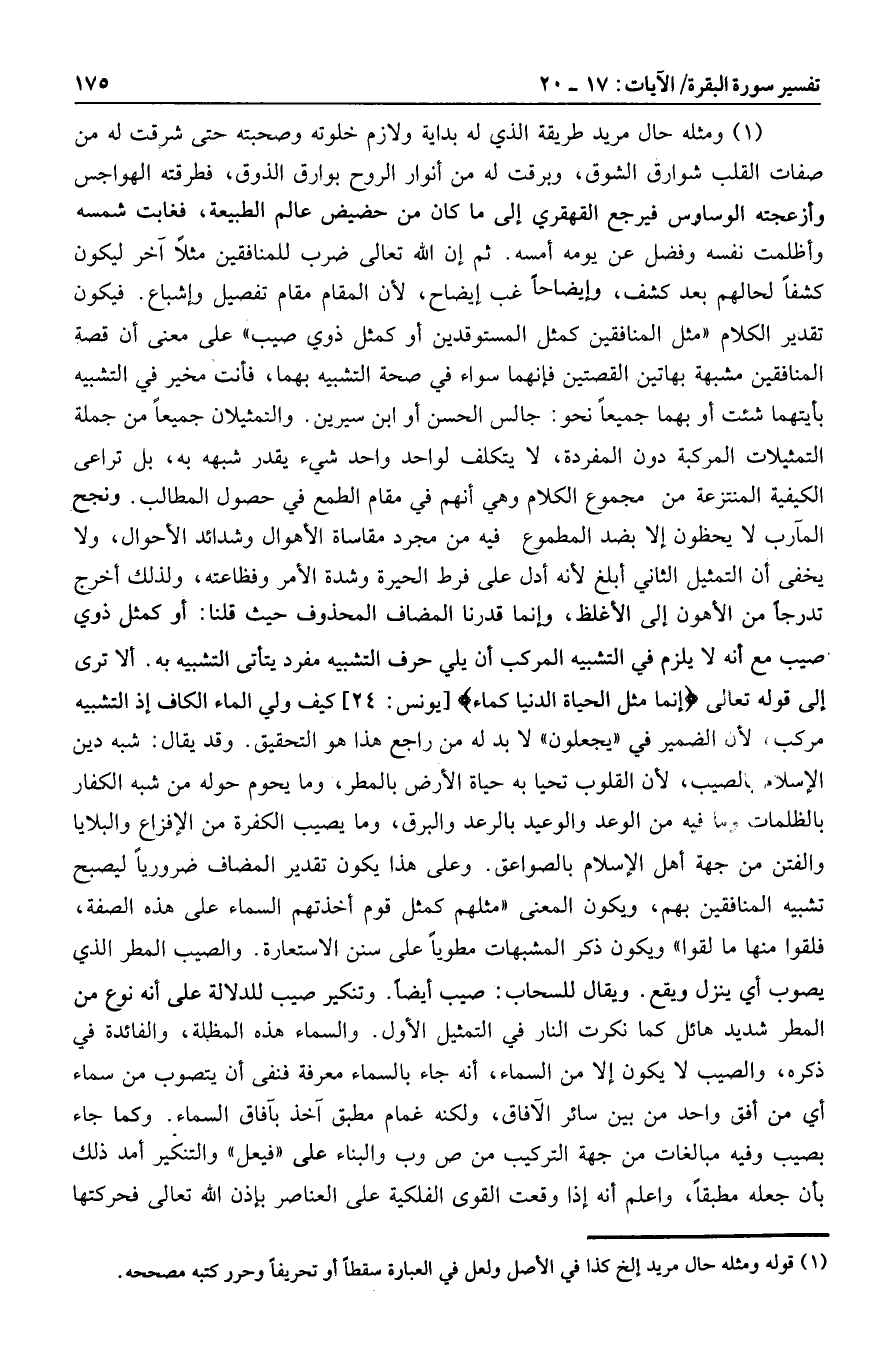 «1» ومثله حال مريد طريقة الذي له بداية ولازم خلوته وصحبته حتى شرقت له من صفات القلب شوارق الشوق، وبرقت له من أنوار الروح بوارق الذوق، فطرقته الهواجس وأزعجته الوساوس فيرجع القهقري إلى ما كان من حضيض عالم الطبيعة، فغابت شمسه وأظلمت نفسه وفضل عن يومه أمسه. ثم إن الله تعالى ضرب للمنافقين مثلا آخر ليكون كشفا لحالهم بعد كشف، وإيضاحا غب إيضاح، لأن المقام مقام تفصيل وإشباع. فيكون تقدير الكلام «مثل المنافقين كمثل المستوقدين أو كمثل ذوي صيب» على معنى أن قصة المنافقين مشبهة بهاتين القصتين فإنهما سواء في صحة التشبيه بهما، فأنت مخير في التشبيه بأيتهما شئت أو بهما جميعا نحو: جالس الحسن أو ابن سيرين. والتمثيلان جميعا من جملة التمثيلات المركبة دون المفردة، لا يتكلف لواحد واحد شيء يقدر شبهه به، بل تراعى الكيفية المنتزعة من مجموع الكلام وهي أنهم في مقام الطمع في حصول المطالب. ونجح المآرب لا يحظون إلا بضد المطموع فيه من مجرد مقاساة الأهوال وشدائد الأحوال، ولا يخفى أن التمثيل الثاني أبلغ لأنه أدل على فرط الحيرة وشدة الأمر وفظاعته، ولذلك أخرج تدرجا من الأهون إلى الأغلظ، وإنما قدرنا المضاف المحذوف حيث قلنا: أو كمثل ذوي صيب مع أنه لا يلزم في التشبيه المركب أن يلي حرف التشبيه مفرد يتأتى التشبيه به. ألا ترى إلى قوله تعالى إِنَّما مَثَلُ الْحَياةِ الدُّنْيا كَماءٍ [يونس: 24] كيف ولي الماء الكاف إذ التشبيه مركب لأن الضمير في «يجعلون» لا بد له من راجع هذا هو التحقيق. وقد يقال: شبه دين الإسلام بالصيب، لأن القلوب تحيا به حياة الأرض بالمطر، وما يحوم حوله من شبه الكفار بالظلمات وما فيه من الوعد والوعيد بالرعد والبرق، وما يصيب الكفرة من الإفزاع والبلايا والفتن من جهة أهل الإسلام بالصواعق. وعلى هذا يكون تقدير المضاف ضروريا ليصبح تشبيه المنافقين بهم، ويكون المعنى «مثلهم كمثل قوم أخذتهم السماء على هذه الصفة، فلقوا منها ما لقوا» ويكون ذكر المشبهات مطويا على سنن الاستعارة. والصيب المطر الذي يصوب أي ينزل ويقع. ويقال للسحاب: صيب أيضا. وتنكير صيب للدلالة على أنه نوع من المطر شديد هائل كما نكرت النار في التمثيل الأول. والسماء هذه المظلة، والفائدة في ذكره، والصيب لا يكون إلا من السماء، أنه جاء بالسماء معرفة فنفى أن يتصوب من سماء أي من أفق واحد من بين سائر الآفاق، ولكنه غمام مطبق آخذ بآفاق السماء. وكما جاء بصيب وفيه مبالغات من جهة التركيب من ص وب والبناء على «فيعل» والتنكير أمد ذلك بأن جعله مطبقا، واعلم أنه إذا وقعت القوى الفلكية على العناصر بإذن الله تعالى فحركتها